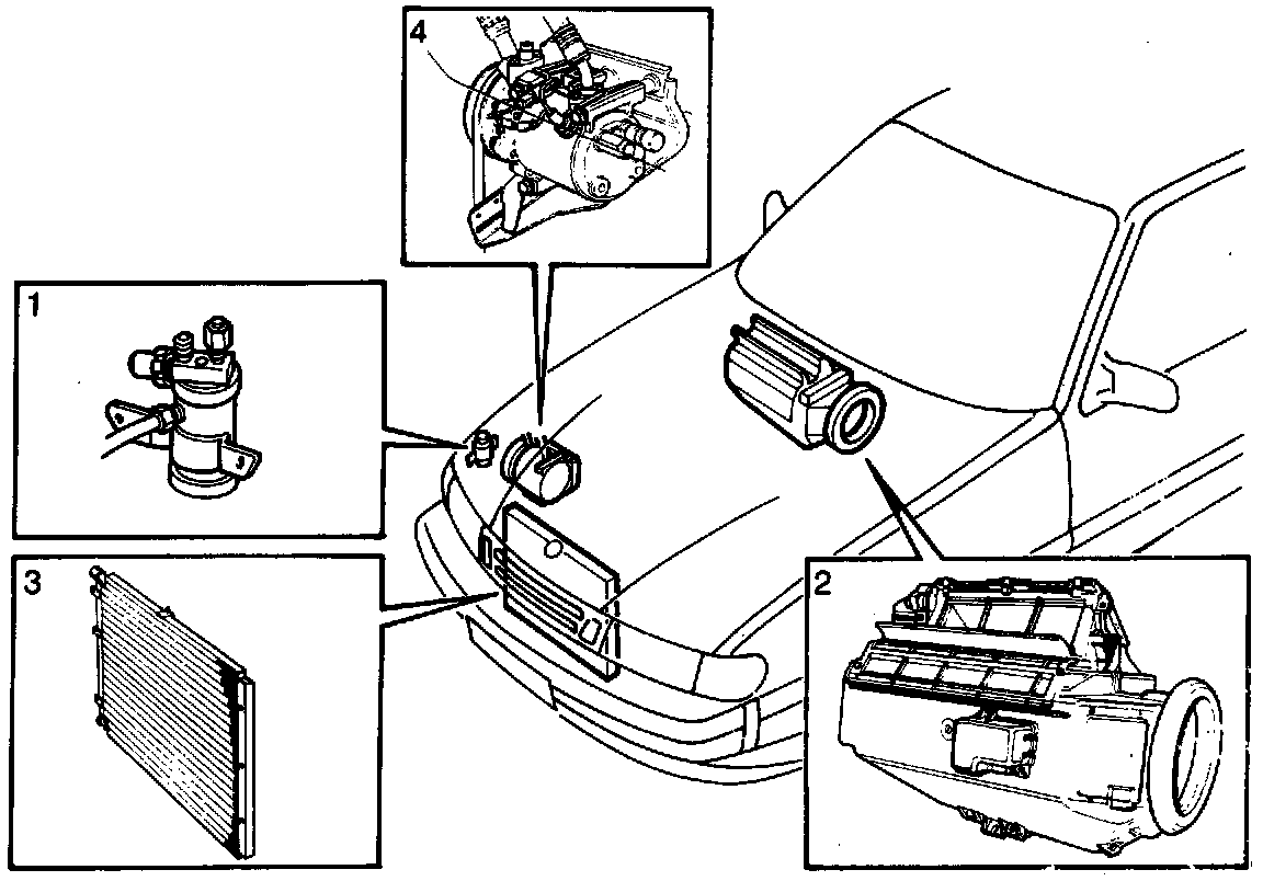 - 1-Desiccant container, 2-Evaporator, 3-Condenser and 4-Compressor.