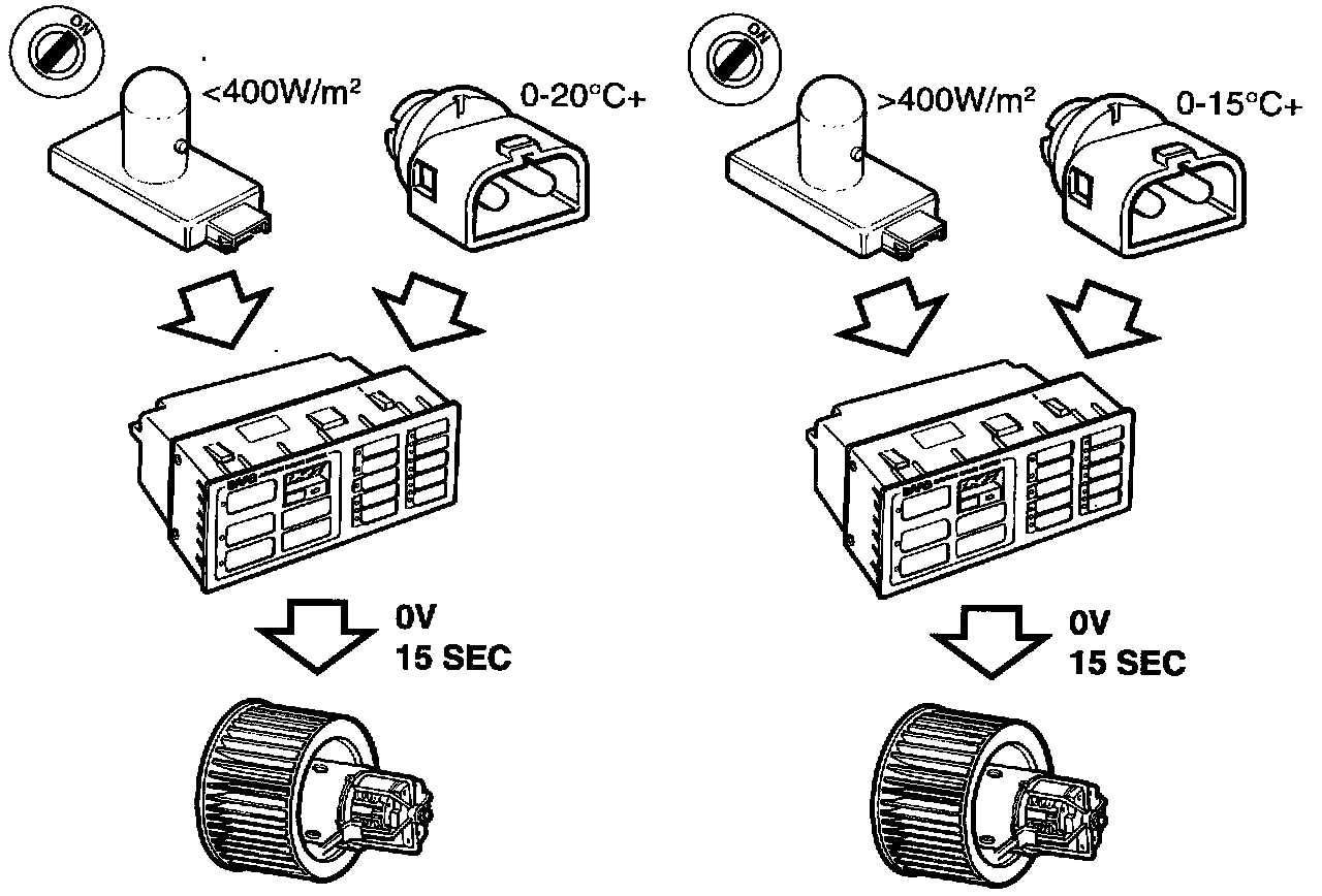 Delay of ventilation fan start is selected when the outside temperature is 0 - 20° C (32 - 68° F) and solar intensity is below 400 W/sq.m, or outside temperature is 0 - 15° C (59° F) and solar intensity is greater than 400 W/sq.m.