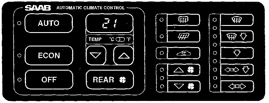 If "REAR" is pressed at the same time as one of the buttons for increasing or decreasing fan speed, only rear fan speed increases or decreases. Speed is fixed at that speed at which the fan is running when the buttons are released. Only the front fan will be controlled automatically. Further manual raising or lowering of fan speed only affects the front fan. Returning to / from manual selection to automatic control is, as previously, achieved by pressing the "AUTO" button.