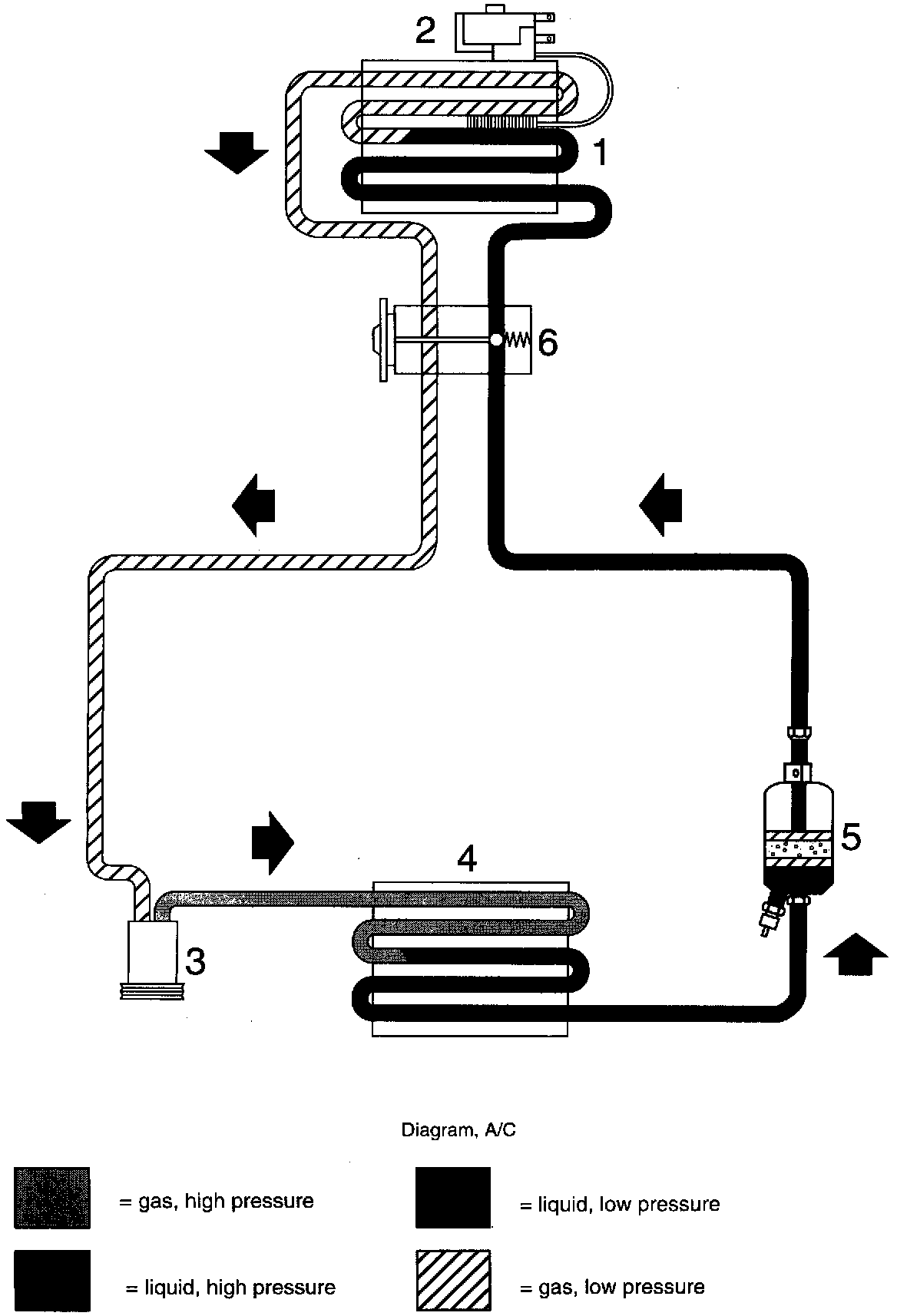When the refrigerant comes from the expansion valve in to the evaporator, it expands. The pressure in the evaporator is much lower due to the suction effect of the compressor. As refrigerant expands, it becomes gaseous (boils). However, in order for evaporation to take place, heat must be supplied. This heat is taken from the air around the evaporator. The cold air is then blown into the cabin by the fan. Refrigerant is then directed on in gaseous form to the compressor.