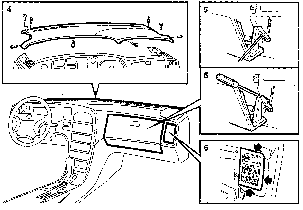 6. Remove the glove compartment together with the facia vent by undoing the six screws, Using a screwdriver, carefully pry along the facia vent. Note the position of the clip. Detach cables from glove compartment lamp and the lighting switch.