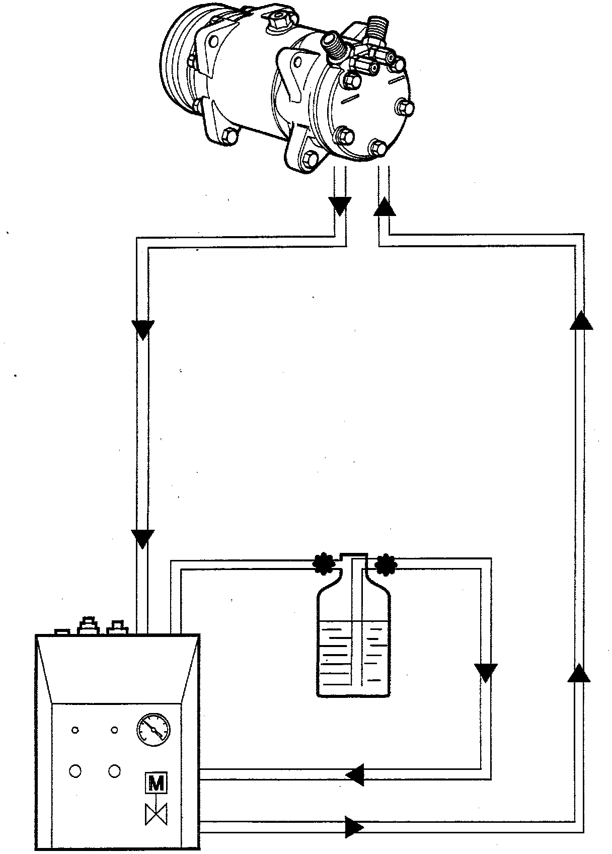 14. Continue flushing until no more bubbles are visible in the sight glass. Rotate the compressor swash plate a couple of turns during the flushing process.