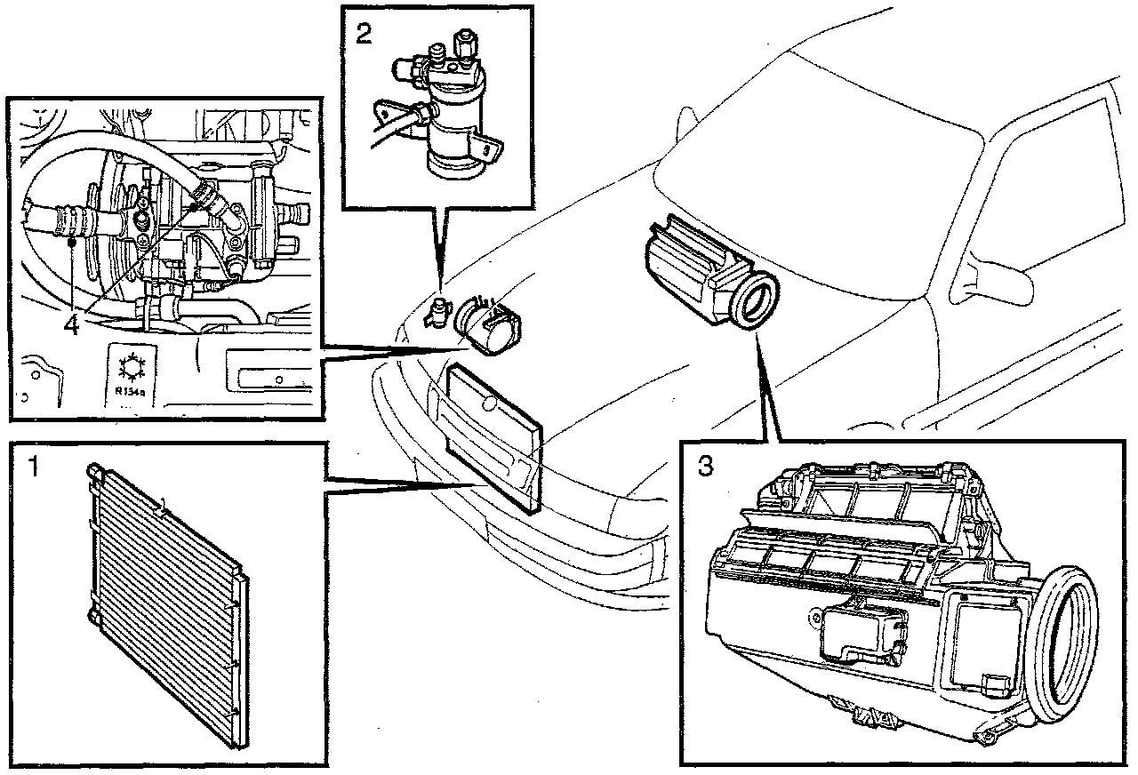 The condenser, receiver, evaporator housing and hoses are the same in both systems. To prevent these components from being mixed with each other after they after they have been replaced, a special marking paint for R134a components has been introduced.