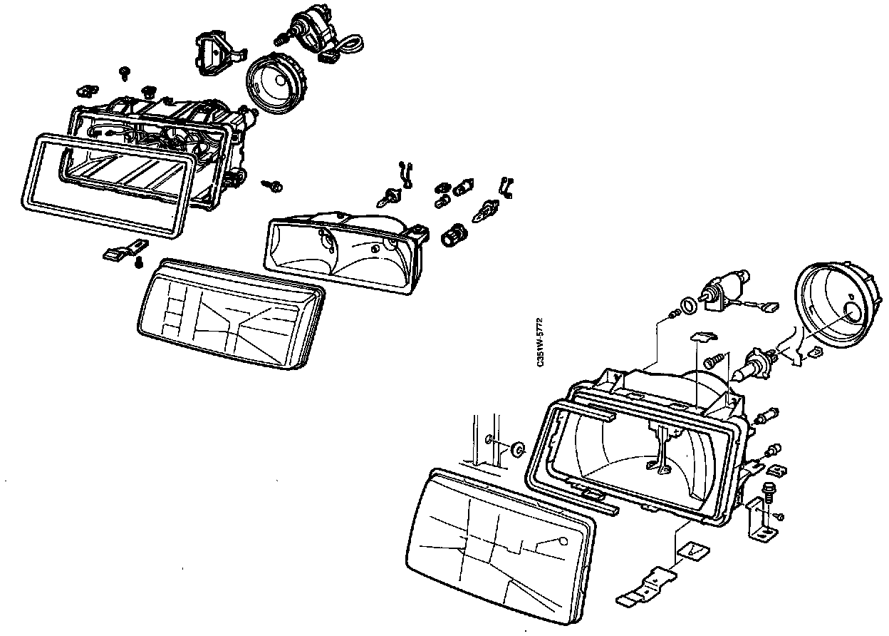 A pictogram incorporated in the main instrument display panel monitors the bulbs in the headlamps and rear light clusters. The headlamps are built into the front of the car and installed with replaceable lenses not US, JP).