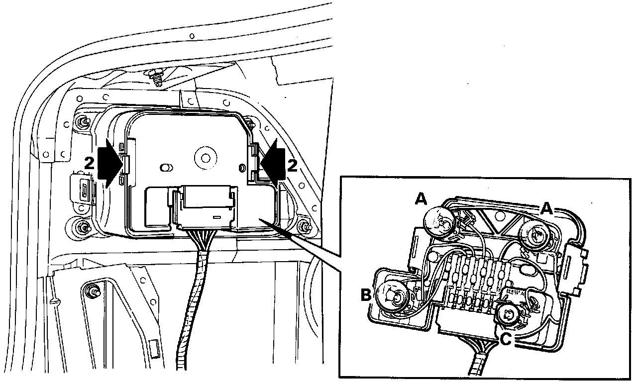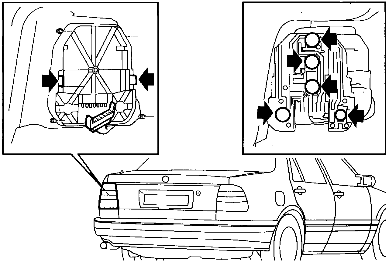 The rear light cluster is divided into an upper black part and a lower red pant. The upper black part contains the direction indicators (A) and the lower red part contains the rear light (B), brake light (C) and reflectors. US specification cars also have side reflectors in the lower part of the rear light cluster.