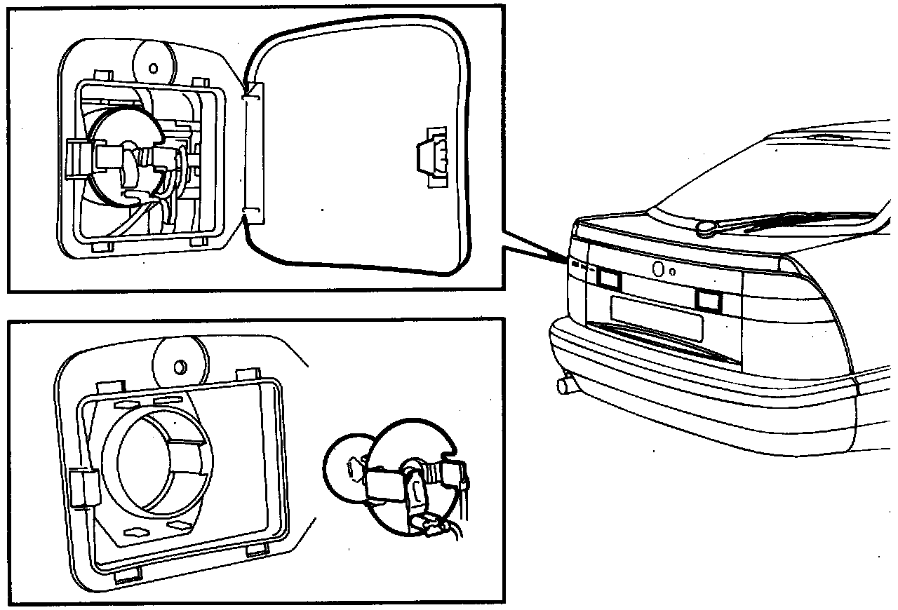 To change the reversing light and rear fog light bulbs, open the cover on the inside of the tailgate Depress the plastic catches to release the bulb holder.