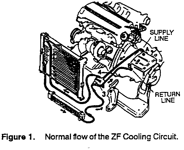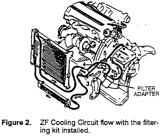 When replacing a 9000 automatic transmission is replaced, the ATF in the cooling circuit must be filtered to avoid possible contamination of the new transmission. A filtering kit, P/N 87 91 824, was designed specifically for this purpose and uses a standard Saab long-life engine oil filter. When installed, the filtering kit will reverse the flow of ATF (see Figures 1 and 2) through both of the coolers and thermostat, where equipped. The ATF will then pass through the filter before being returned to the transmission.