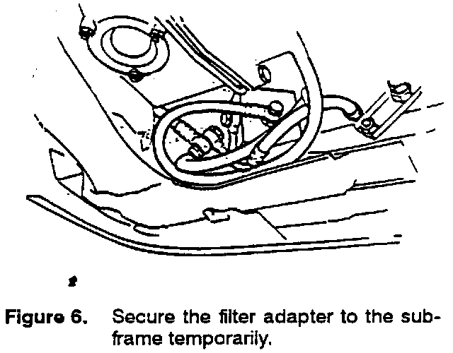 6. Place the filter and adapter on the subframe and tie it down temporarily using a tie-wrap or mechanics wire (Figure 6). Be sure hoses are not kinked.