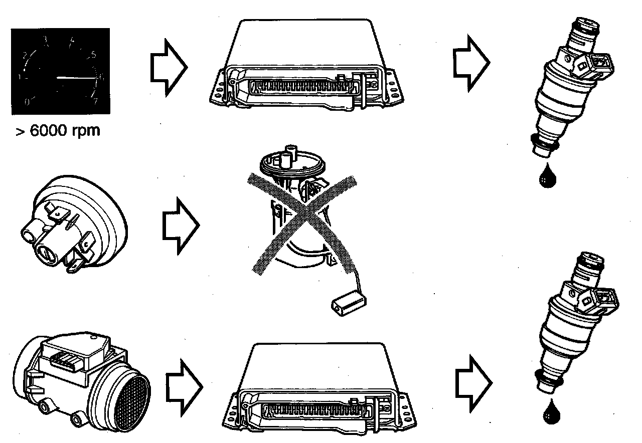 If engine speed exceeds 6,000 rpm the injectors are disconnected until engine speed drops. This is a safety measure to avoid damaging the engine. To protect the turbo engine from excessively high boost pressure, a pressure switch is fitted on cars equipped with the LH 2.2 system. It boost pressure climbs too high, the pressure switch cuts off the fuel pump's power supply.