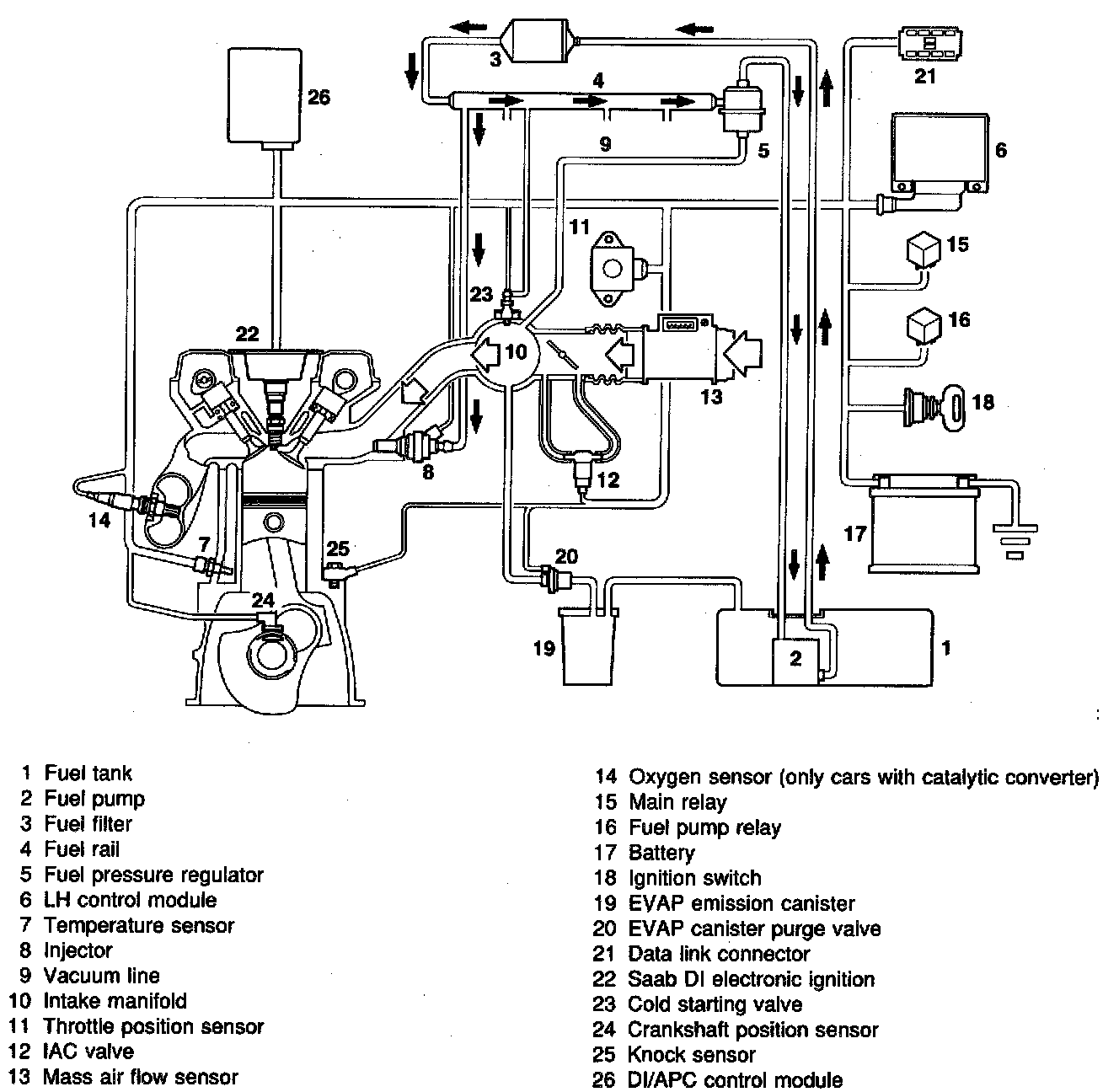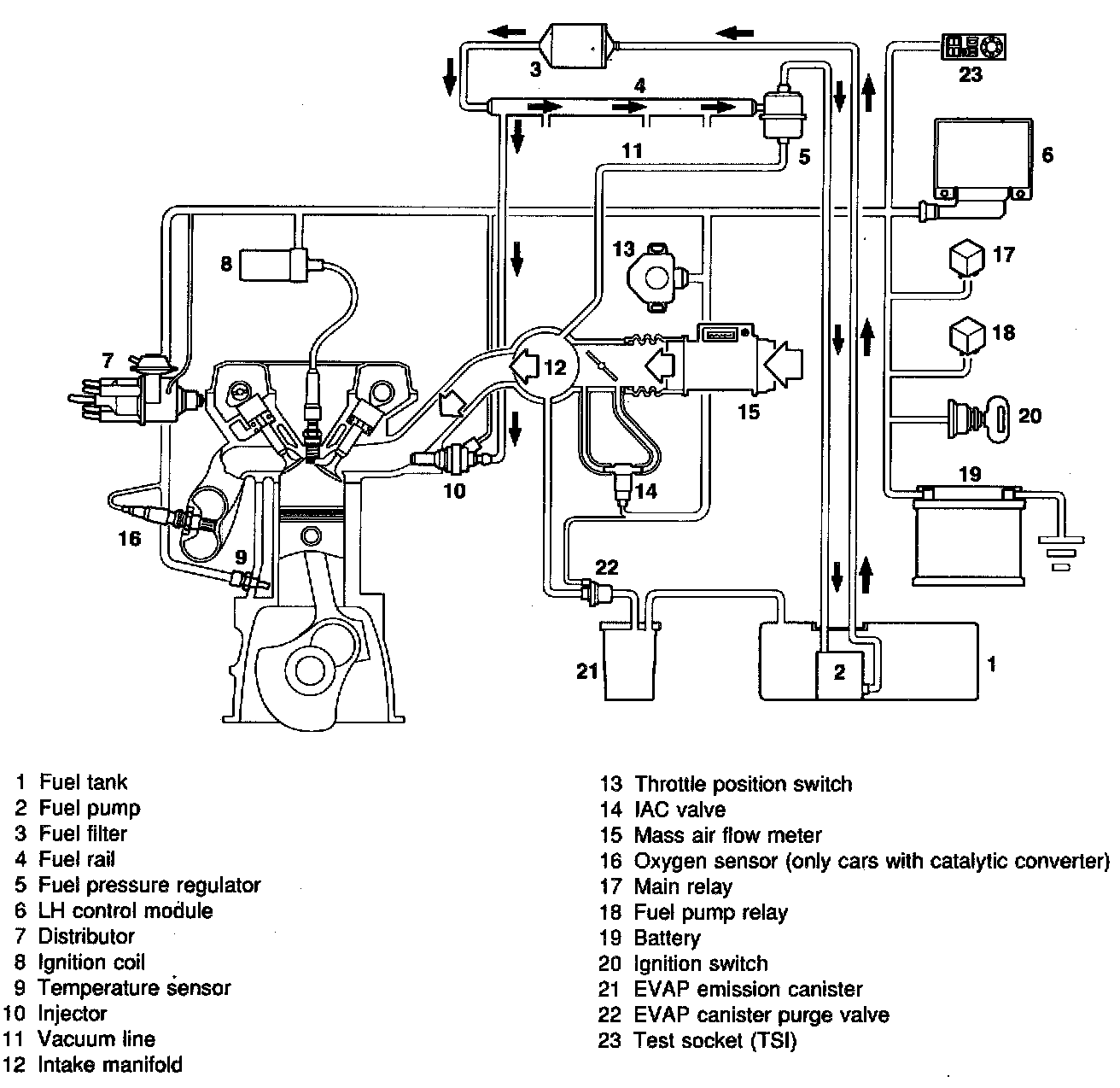 Signals from the temperature sensor (engine coolant temperature), or throttle position switch / sensor are sent to the control module. The control module is also supplied with ignition pulses from the ignition system and signals from the mass air flow sensor. On the basis of these signals and stored data, the control module calculates the opening duration of the injectors.