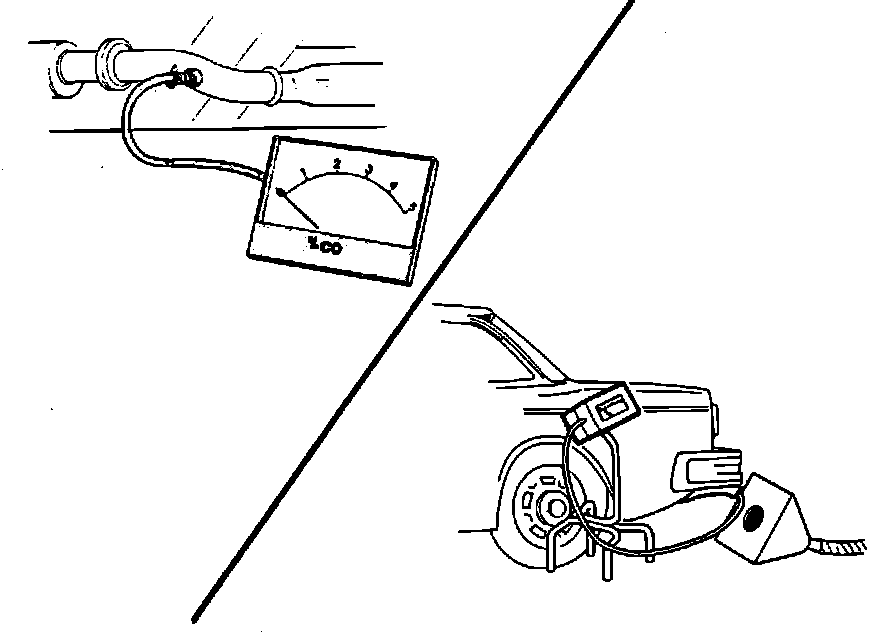 The efficiency of the catalytic converter can be checked by measuring and comparing the CO content before and after the converter. The CO content at the tailpipe must be substantially lower then the CO content at the upstream CO tap (before the converter). Fig. 62a.