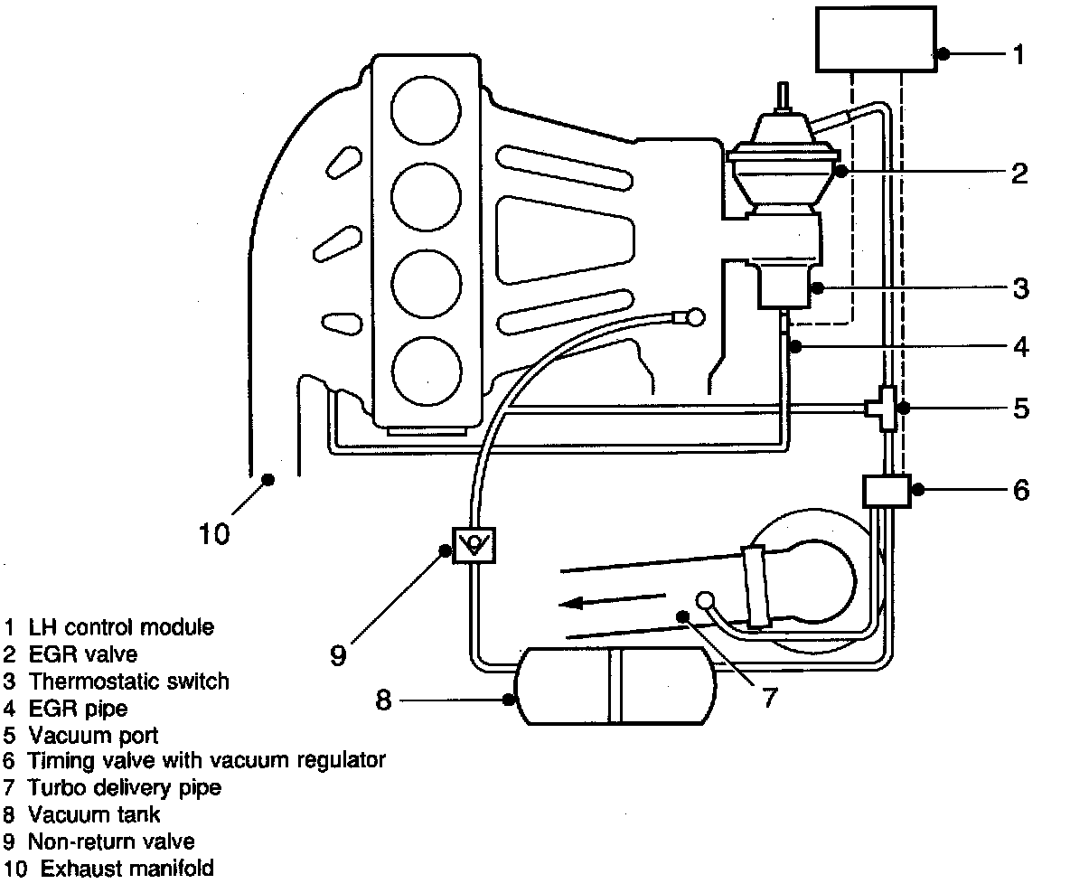 The system consists of a timing valve with vacuum regulator, a vacuum tank with non-return valve and a thermostatic switch. The thermostatic switch supplies information to the LH control module which in its turn controls the timing valve. The timing valve applies varying control pressure to the EGR valve.