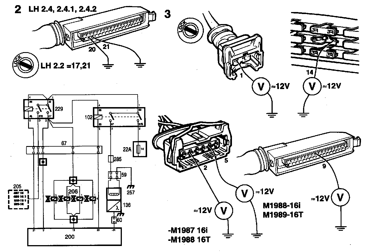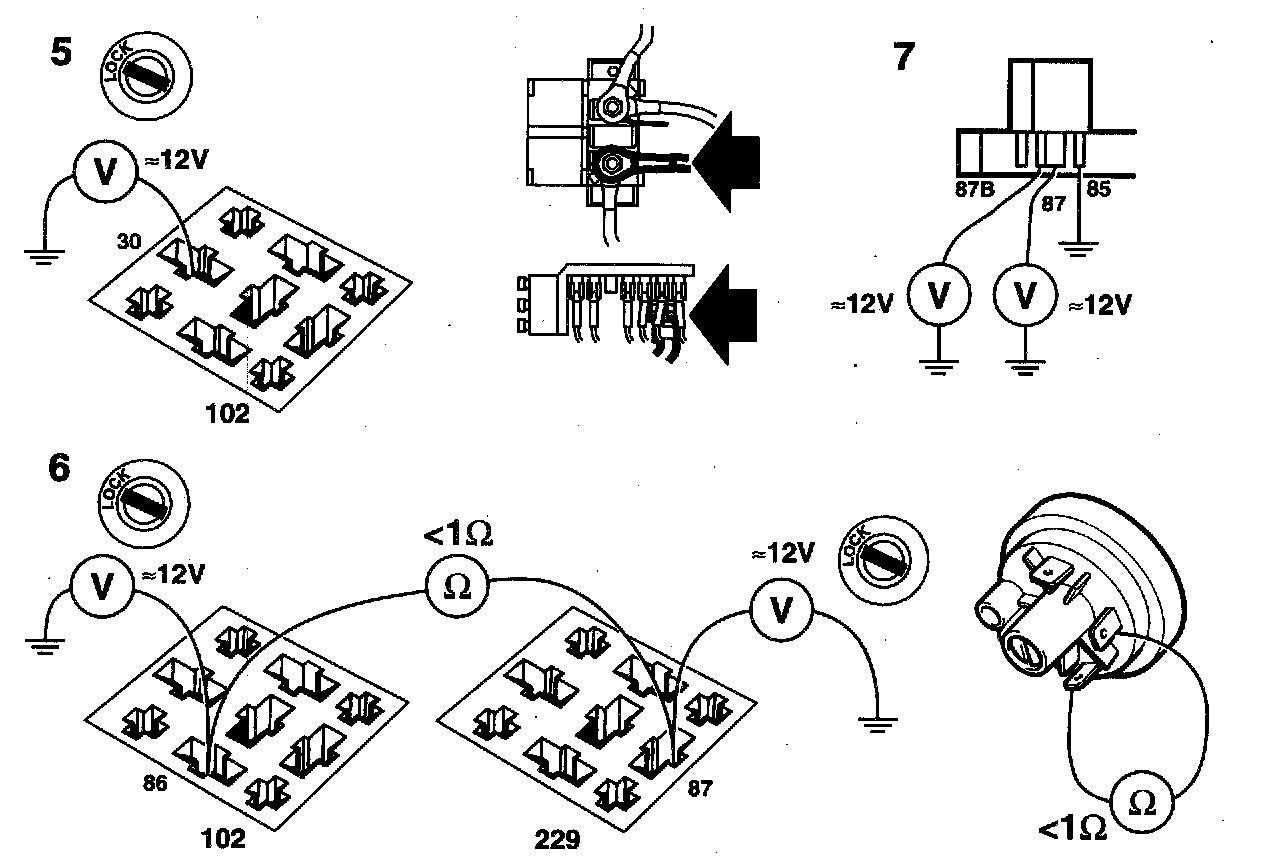 If voltage is present, check that the pressure switch (LH 2.2 turbo engine) and the lead between pump relay terminal 86 and main relay terminal 87 is OK (main relay not operated).