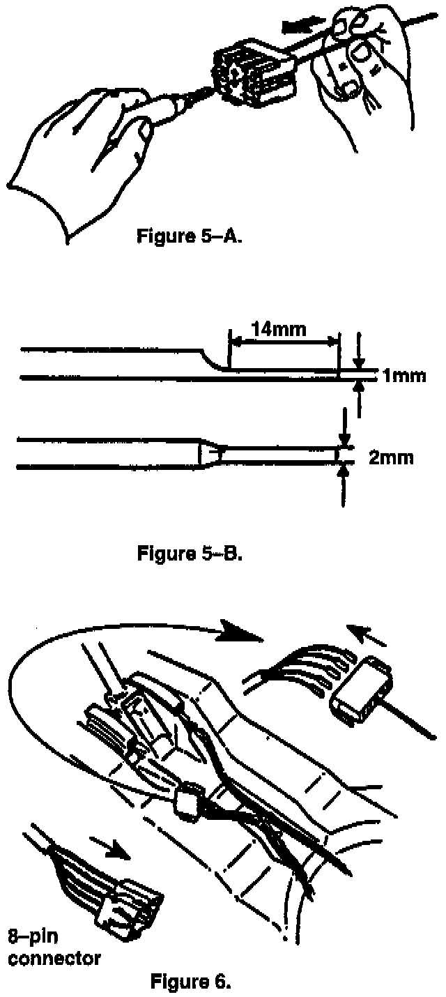 8. The terminals in the five-pin connector (removed from the neutral safety switch) must be removed and inserted into the new eight-pin connector supplied with the kit. To remove the terminals from the connector housing, use connector terminal removal tool, P/N 8580094) (Figure 5-A), or, if this tool is not available, you can make a removal tool by modifying a small pocket screwdriver (Figure 5-B).