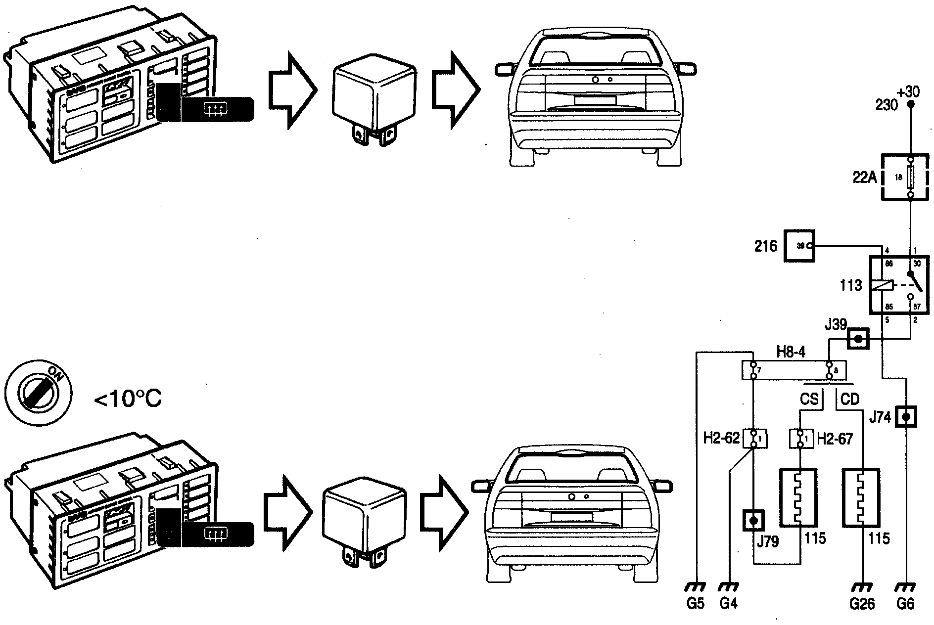 When cabin temperature drops below +10° C (50° F) and the ignition is on, power supply to the relay is automatically engaged for 11 minutes. Switching off after 11 minutes is automatic, even when it has been connected manually using the button on the ACC control module panel.