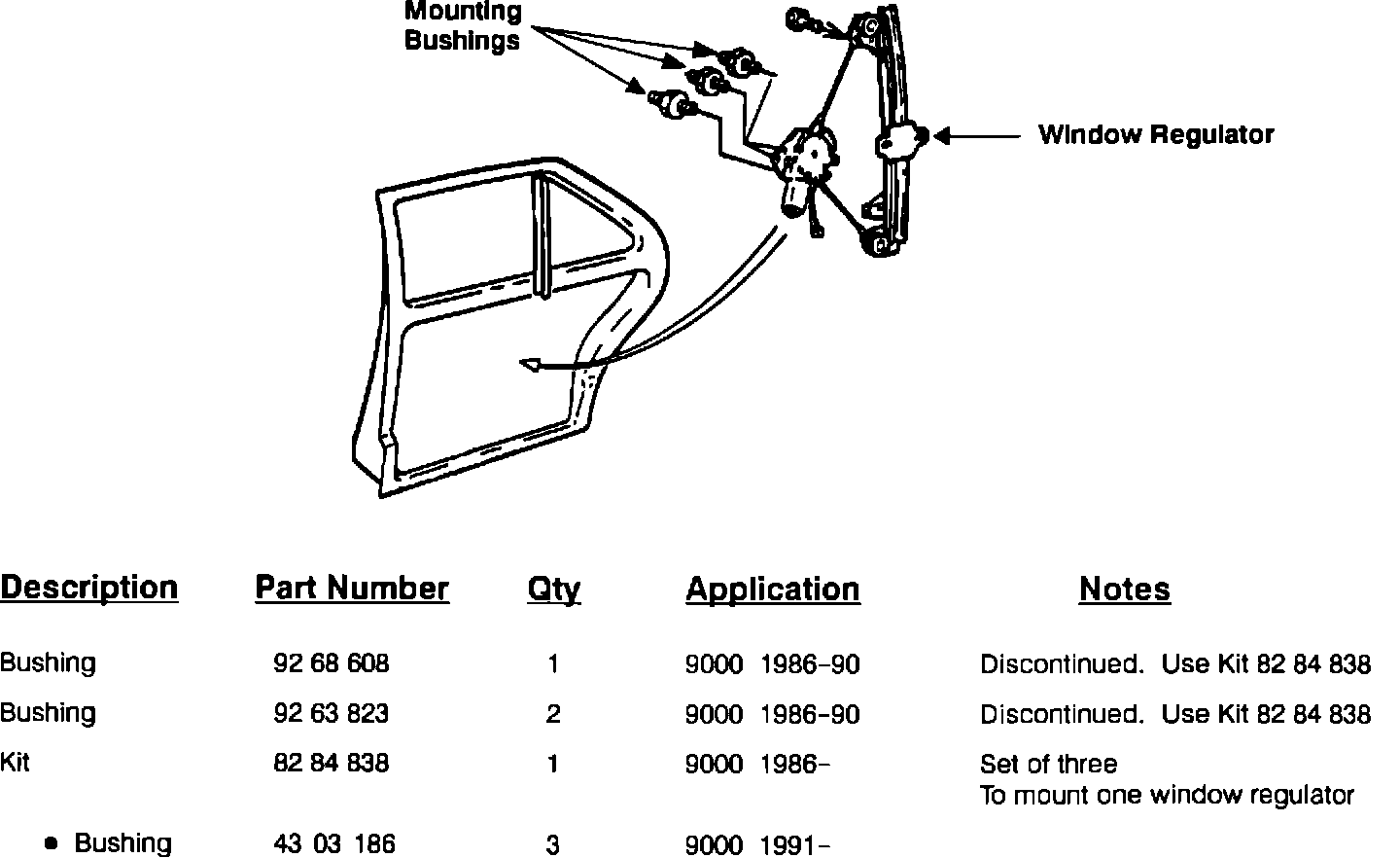 The mounting bushings used to locate the electric window regulator motors in the doors of 9000 models through the 1990 model year have been changed starting with 1991 production. Instead of two different types of bushing, three of the same type are used.