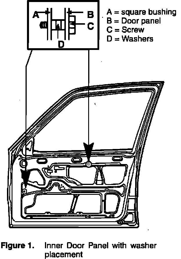 4. Install the proper size washer (3 mm on left side door, 4.5 mm on right side door) between the regulator and the door panel. See Figure 1.