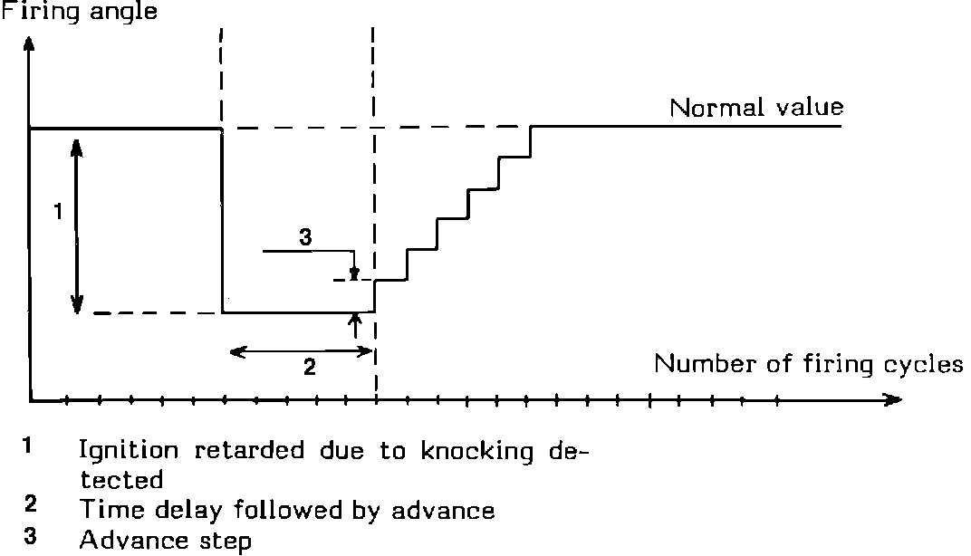When the engine load exceeds a predetermined value stored in the ECU, the ignition timing will be retarded 6° for all cylinders at the same time. The timing will advance again in 1° steps per engine revolution when the load has decreased or levelled off. See Fig. 81 for a chart of the actions performed.