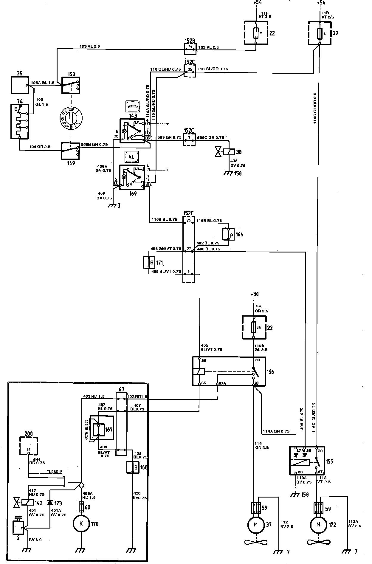 155 Relay for the AC radiator fan in the electrical distribution box in the engine compartment, on the left-hand wheel housing.