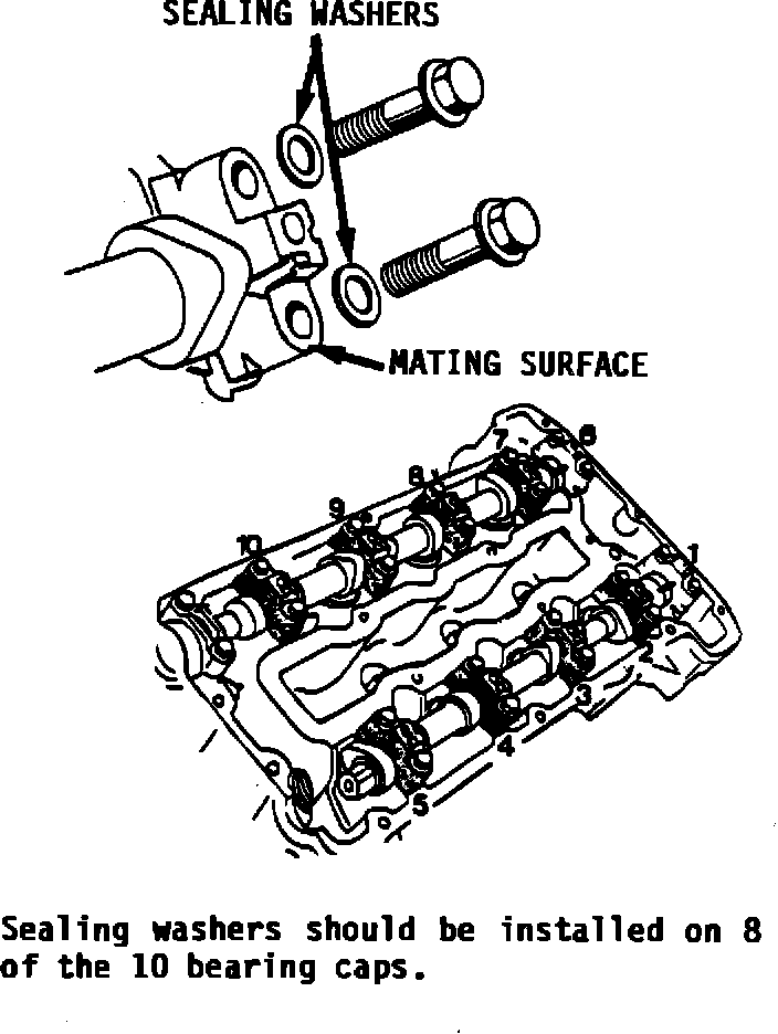 Excessive oil consumption may be caused by a slight distortion of the mating surfaces (see figure) on the camshaft bearing caps. Distortion in this area may allow oil (under pressure) to be sprayed into the crankcase ventilation system and subsequently drawn into the inlet system. To correct this problem, sealing washers must be installed under both bolts on 8 of the 10 bearing caps as described below.