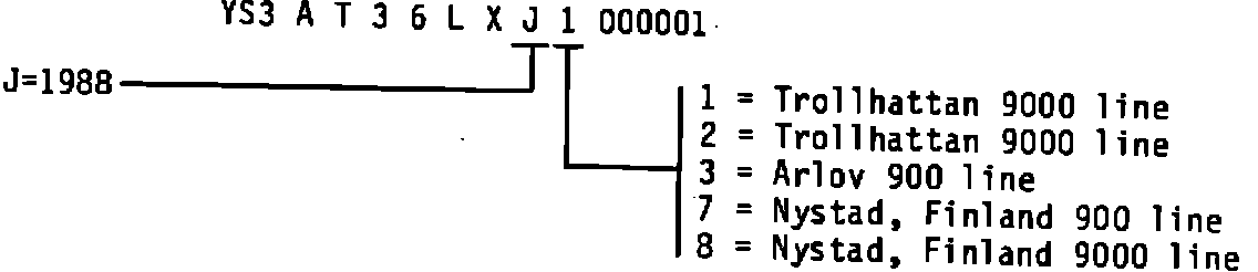 Vehicle Identification Number - The Federally required 17 character VIN incorporates a new designator for model year 1988 - "J". 900 models are no longer built on assembly line 2 as this line has been reserved for 9000 models.