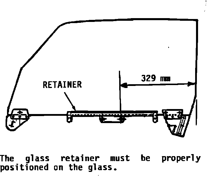 Measure off 329 mm from the rear of the glass (see drawing) to the hole identified in the retainer. Fit the retainer and be sure it grips the glass evenly and securely. If the retainer is not properly positioned or if the retainer is not secure the window may not operate correctly.