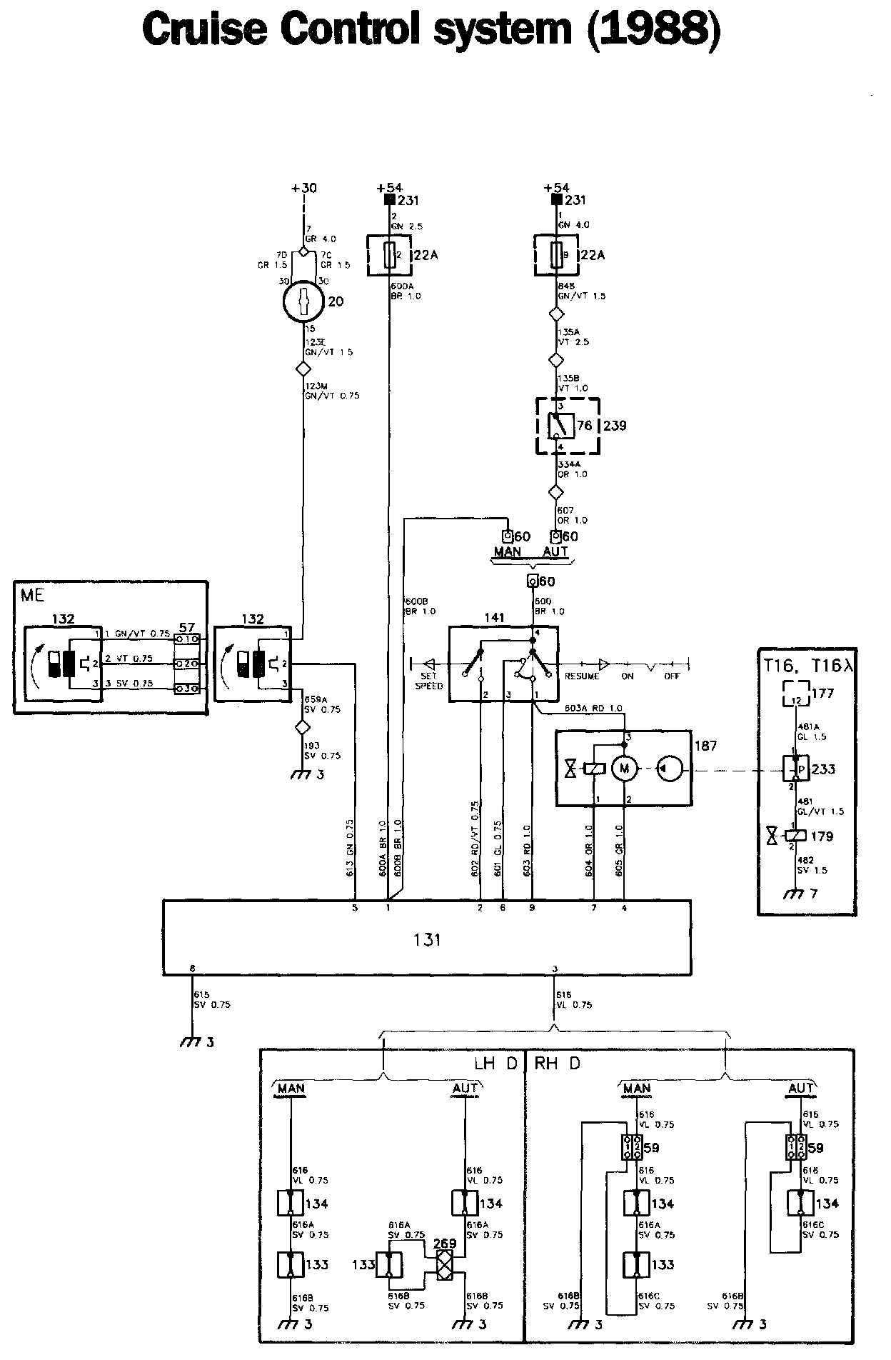 The Cruise Control system is switched in by means of selector 141. When this is set to the ON position, vacuum pump and vacuum valve 187 will be sup- plied. The pump is earthed across terminal 4 and the valve across terminal 7 in the control unit. In addition, power is supplied from the selector to terminal 9 of the control unit.