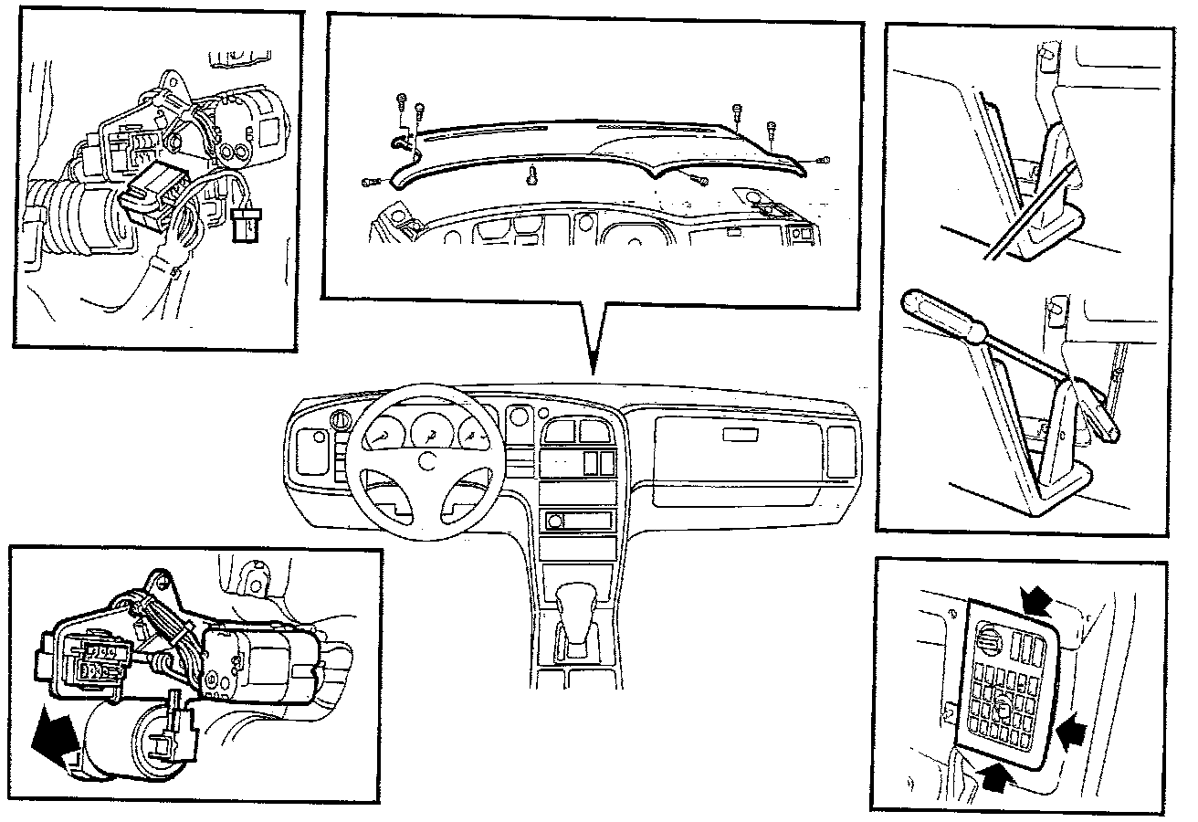 4. Remove the glove compartment together with the facia vent by undoing the six screws. Using a screwdriver, carefully pry along the facia vent. Note the position of the clip. Unplug cables to glove compartment light and light switch.