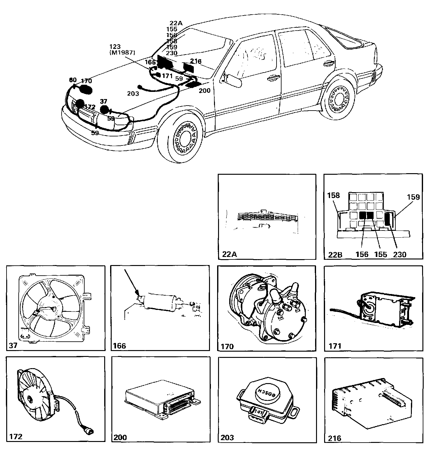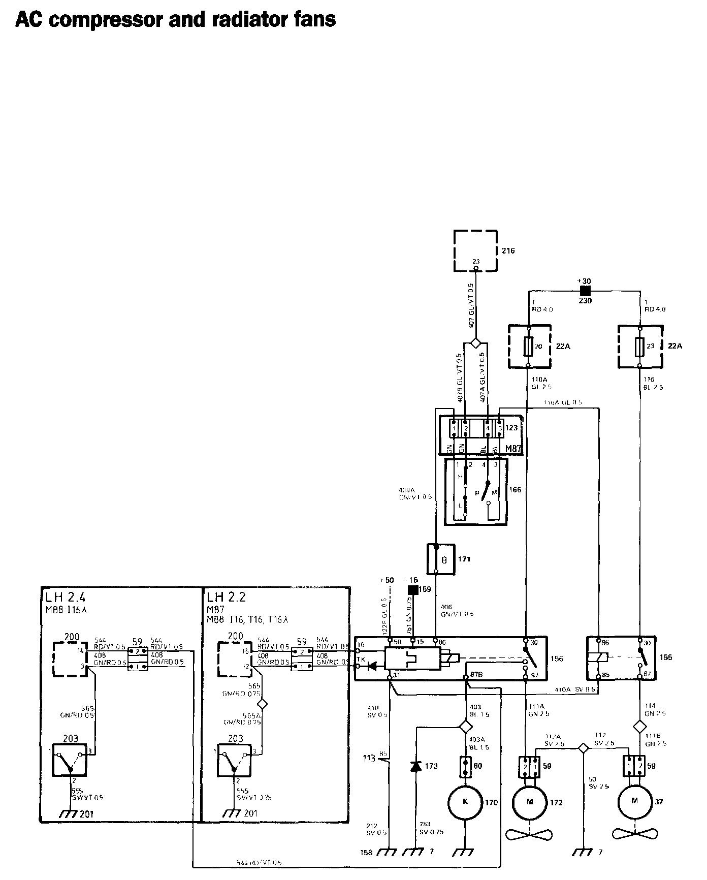 The AC compressor and engine radiator fan are switched on and off from output 23 of climate control unit 216. Cars for certain markets are equipped with auxiliary radiator fan 172 for the AC.