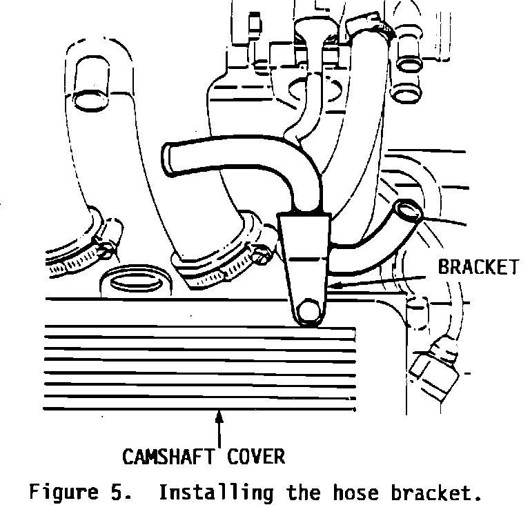 8. Install the hose bracket on the camshaft cover. Secure it with the left rear camshaft cover bolt and the intake manifold bolt (Figure 5).