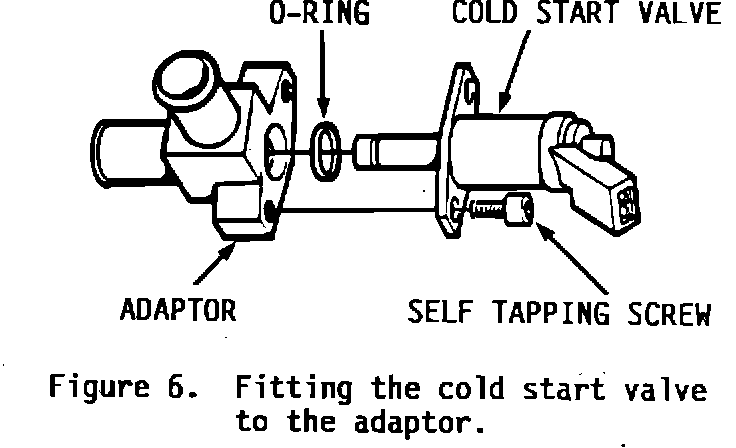 9. Fit the O-ring onto the cold-start valve. Install the valve in the adaptor and secure with two selftapping screws. Note position as shown in Figure 6.