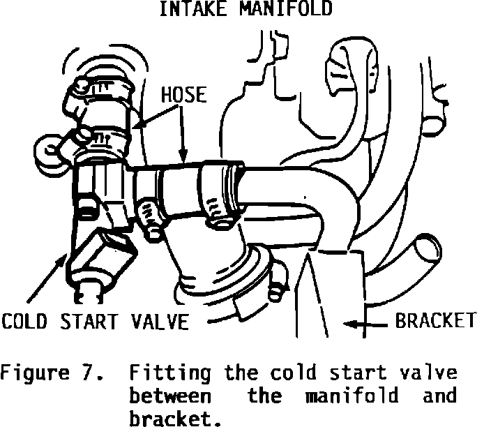 10. Fit the cold start valve with two hoses (P/N 75 60 345) and four hose clamps between the intake manifold and the hose bracket (Figure 7).