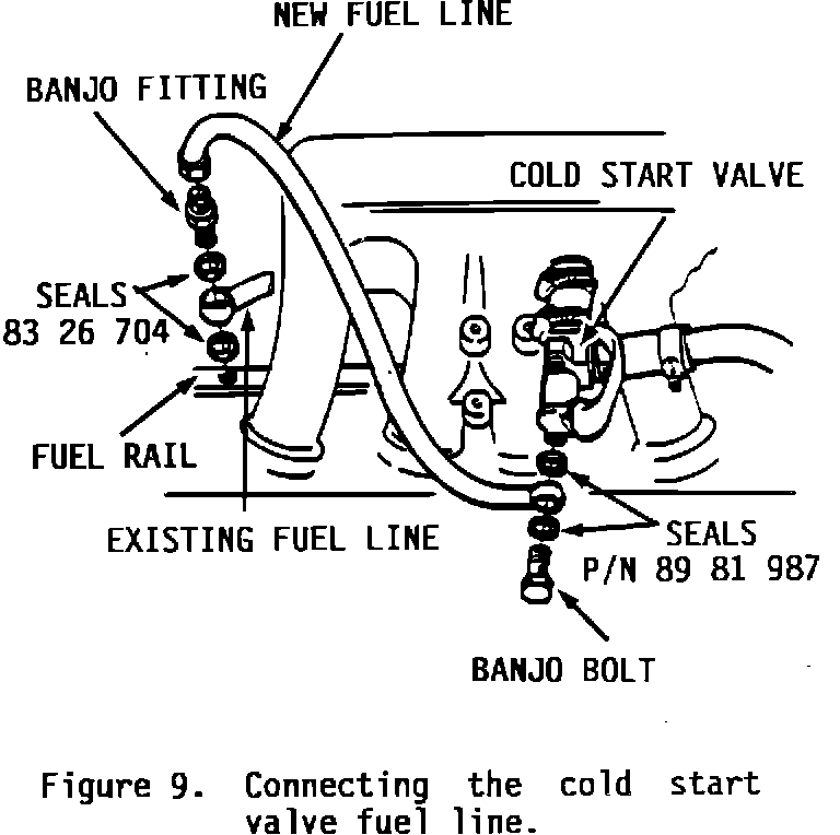 16. Connect the fuel line to the cold start valve using the banjo bolt and two seals (P/N 89 81 987) as shown in (Figure 9).