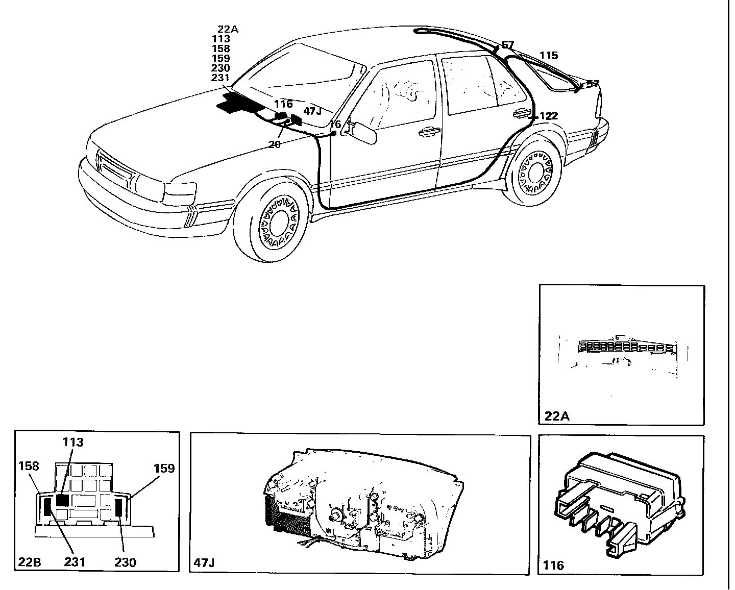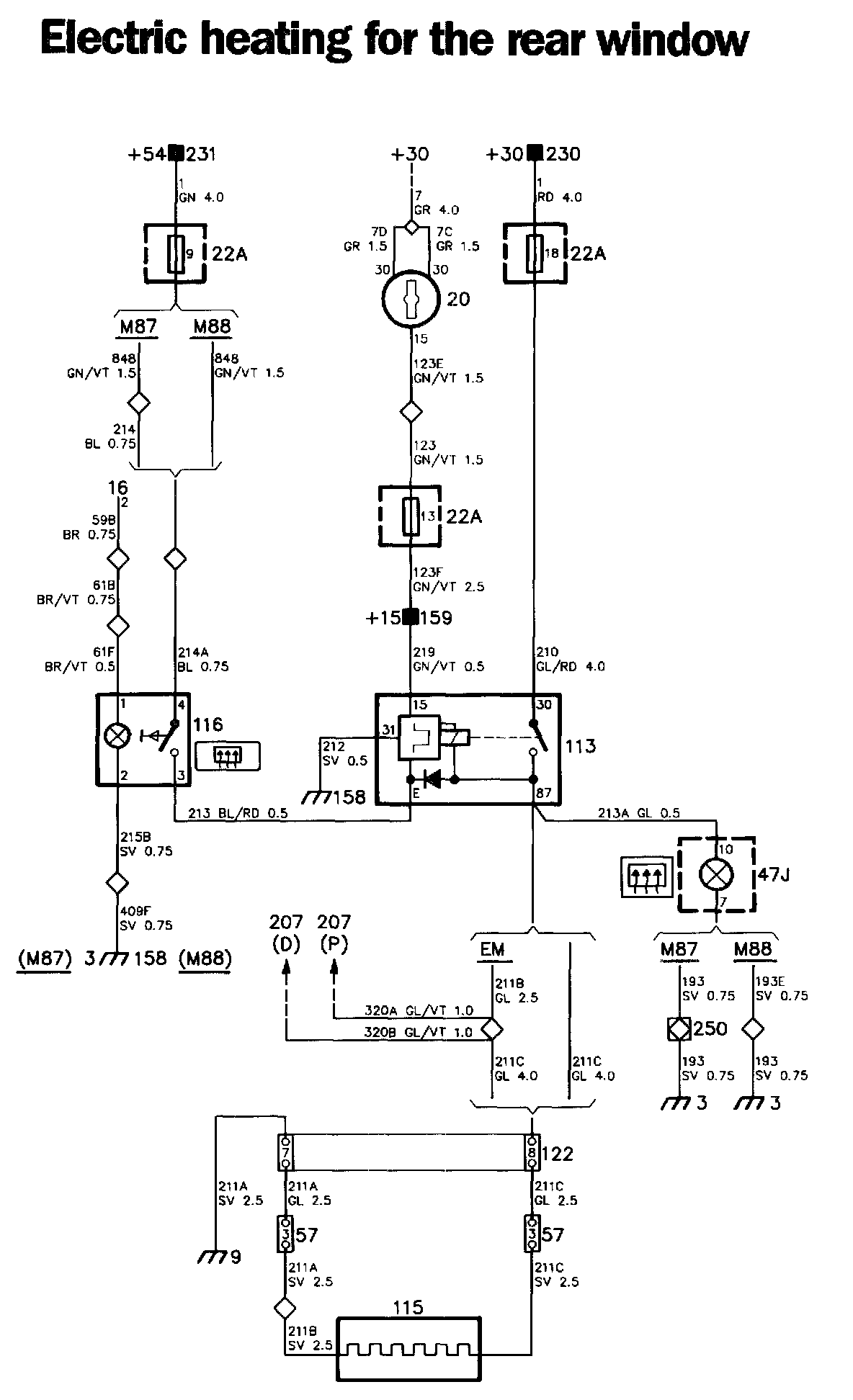 When the switch is depressed, power will be supplied to terminal E of the relay, and the relay will be energized. From terminal 87 of the relay, current will flow through electric heater 115 for the rear window and through the heaters, if any, for the outer rear-view mirrors, to earth and to indicating lamp 47J. The relay has a time-delay function and will keep the circuit closed for ten minutes, after which it will trip.
