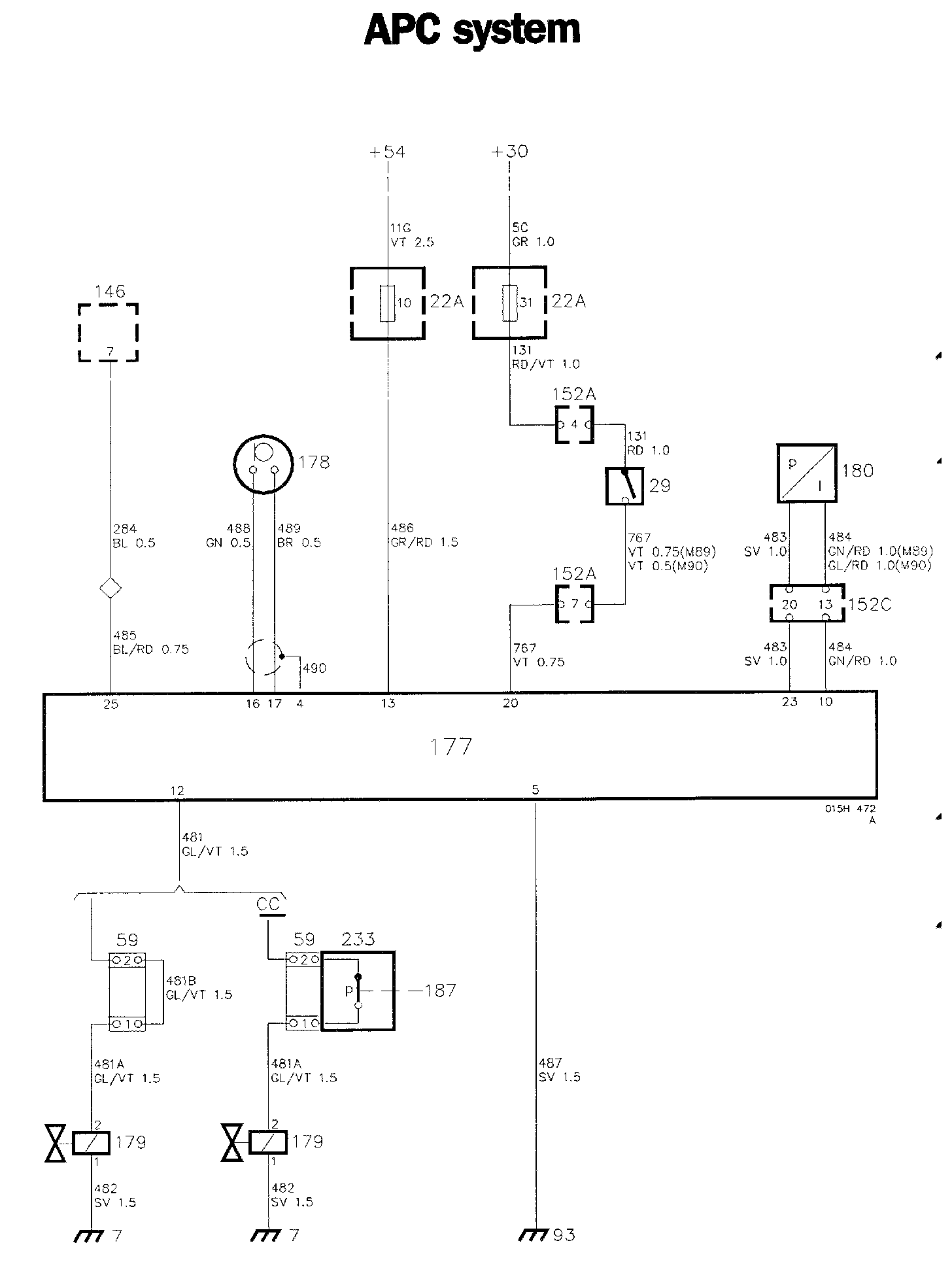 The APC system is controlled by control unit 177, which is supplied (+54) from fuse 10. The unit receives signals from various sensors, processes the signals and then controls the boost pressure of the turbocharger via solenoid valve 179.