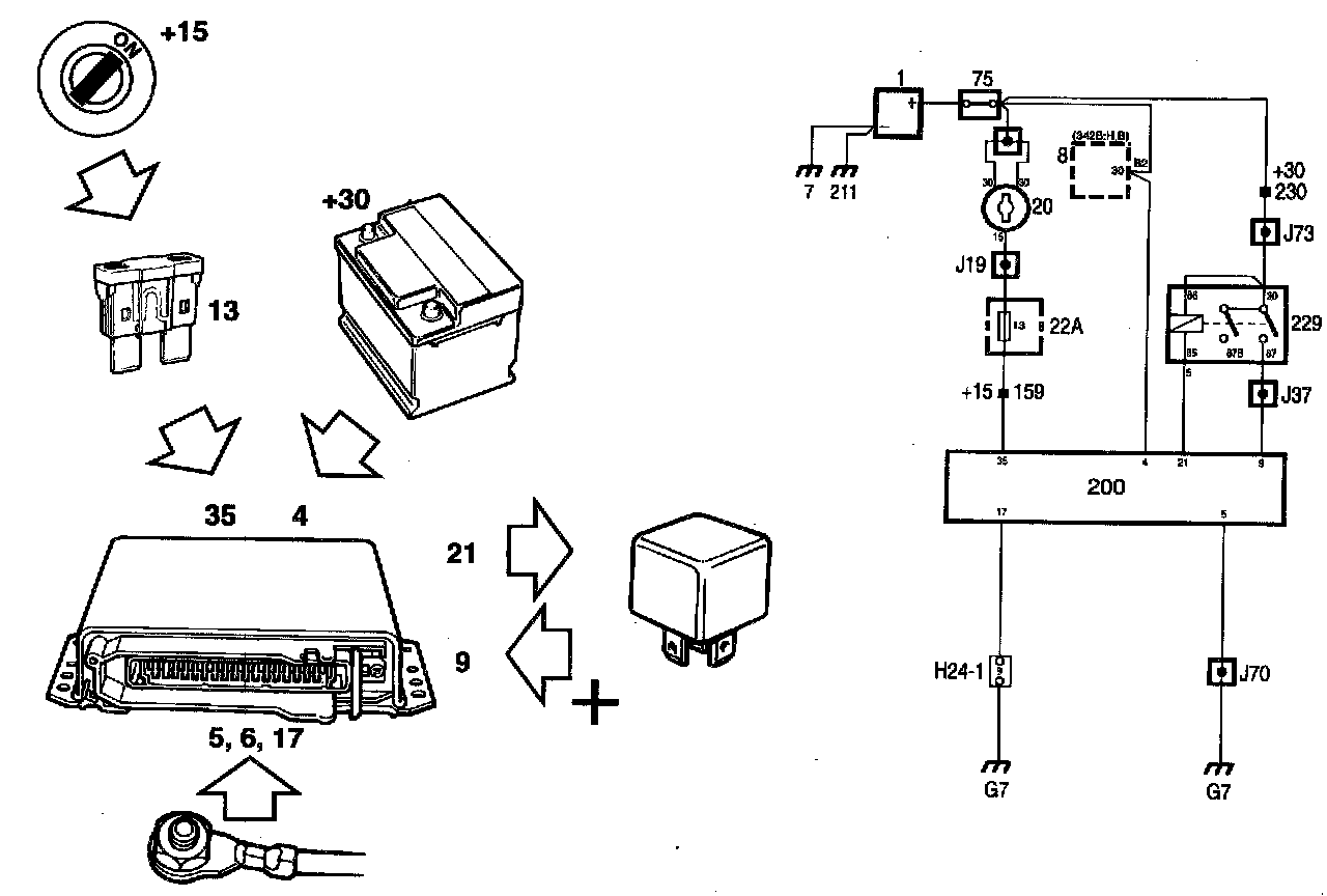 The LH control module is supplied with power continuously via pin 4 (+30 supply). When the ignition switch is in the ON position, +15 current is also supplied to pin 35 via fuse 13. Voltage to and from the main relay is supplied via pins 21 and 9.