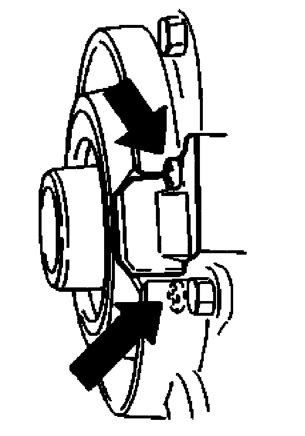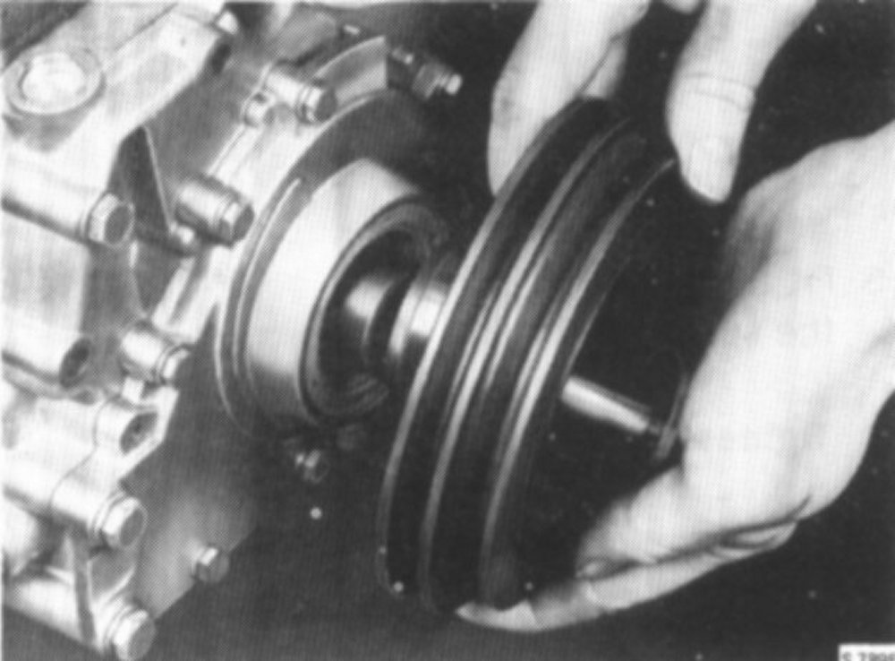 - While holding the flywheel stationary, remove the crankshaft pulley center mounting bolt.