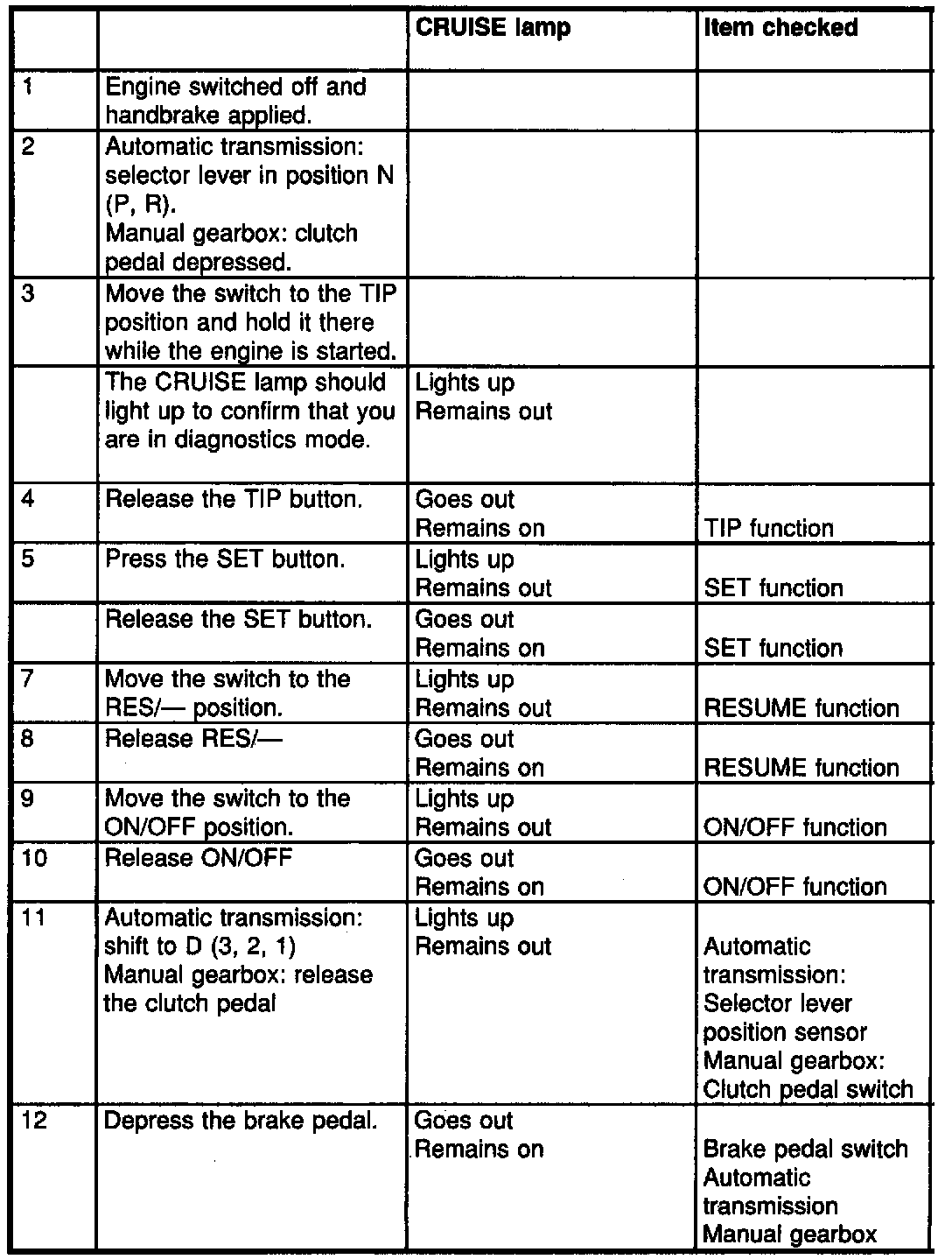 Fault diagnosis is carried out in the self-diagnostics mode. To enter the diagnostics mode, consult the table below.