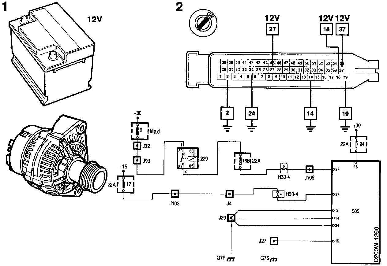 2. Check that the MOTRONIC control module supply voltage is correct on pins 18, 27 and 37, and that pins 2, 14, 19 and 24 are properly connected to a good ground.