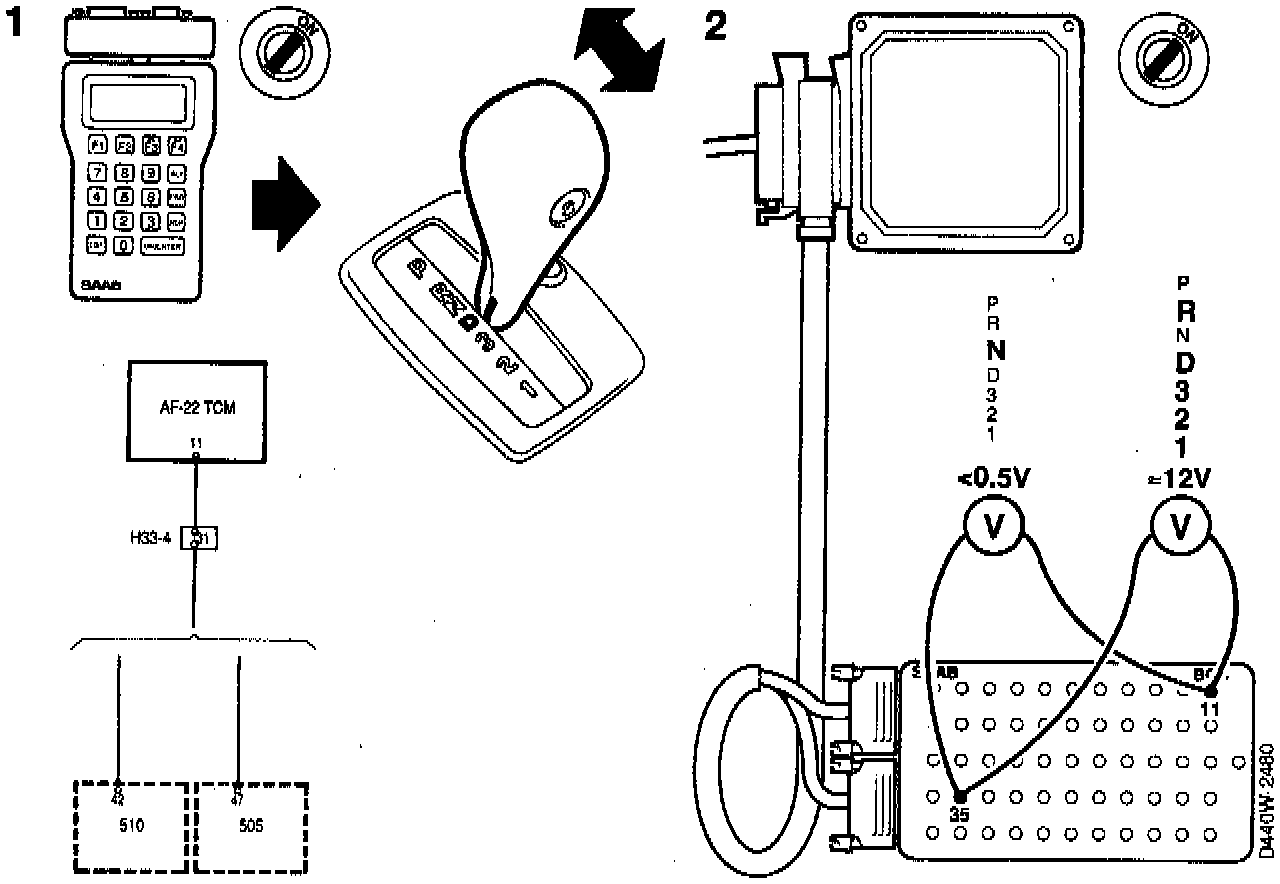 Measure the voltage between pins 11 and 35. Nominal value is <0.5 V with the selector lever in position N and 12 V (battery positive voltage) with the selector lever in positions R, D, 3, 2, 1.