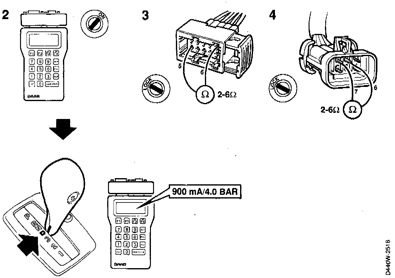 Activate PRESS CTRL SOLENOID in ISAT menu READ FUNCTIONS. Nominal value is about 900 mA/ 3.4 - 4.6 bar at idling. Depress the accelerator pedal and record the change in the value.