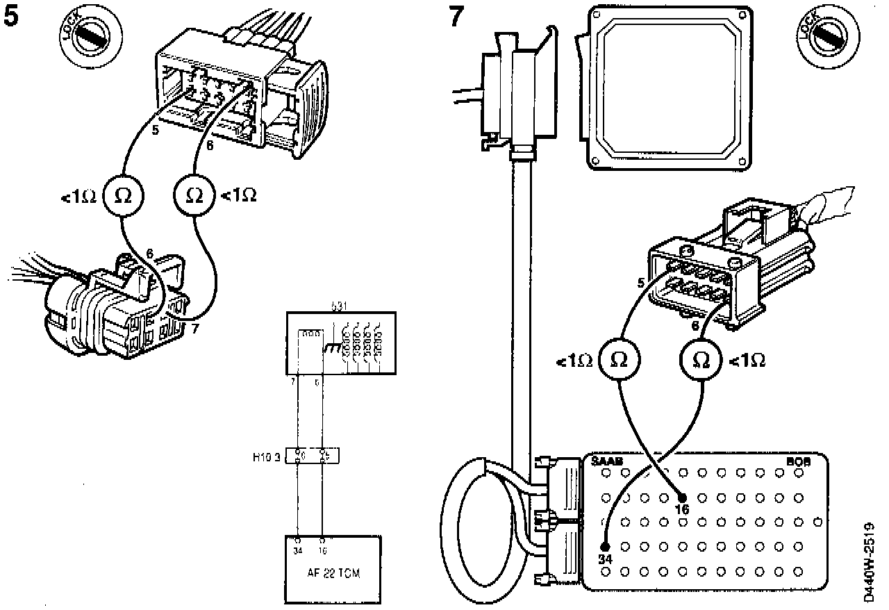 3. With the ignition switched OFF, disconnect connector H10-3 located behind the battery in the engine compartment (grey 10-pin Packard connector). Carry on with continuity measuring. Connect an ohm meter between pins 5 and 6 in the TCM (female). Nominal resistance is 2 - 6 ohms.