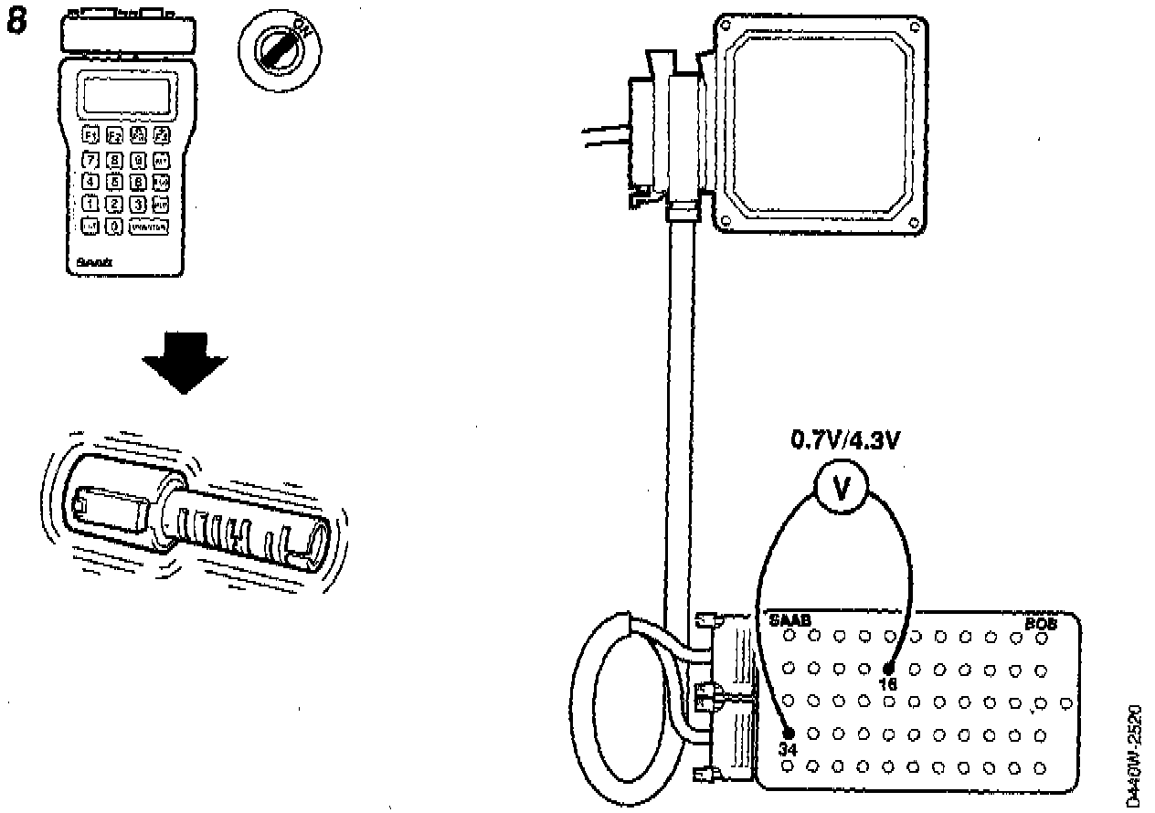8. Connect a BOB to the TCM. Carry out voltage measuring. Connect a voltmeter between pins 16 and 34. Activate the pressure control solenoid by activating PRESS CTRL SOLENOID in ISAT menu ACTIVATE.