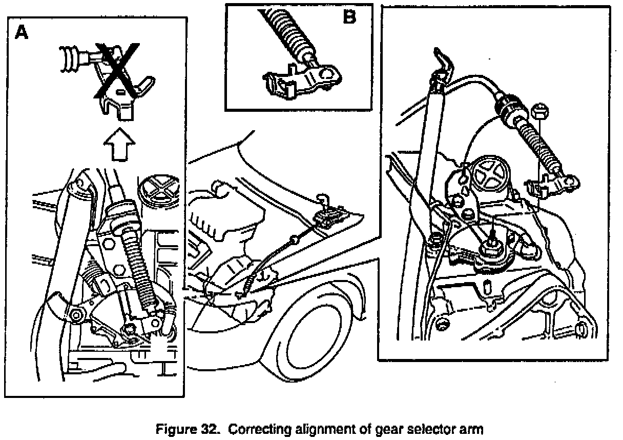 1. Check if the gear selector arm is correctly fitted. If it is not. continue with steps below. The correct orientation is as indicated in Figure 32.B.