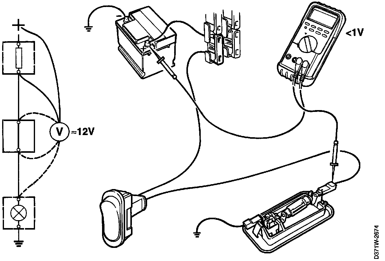 2. Connect the voltmeter's negative lead step by step towards the load (item of electrical equipment), which should be switched on.