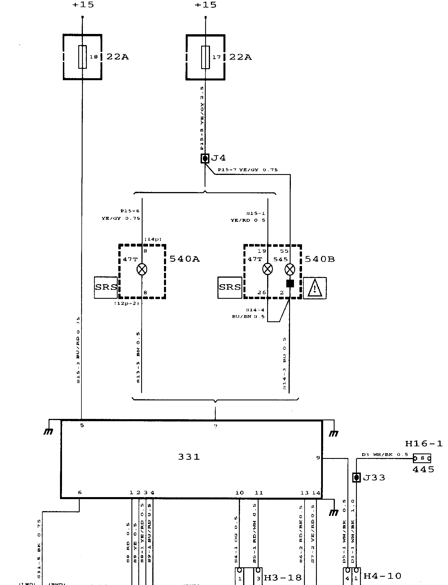 When the ignition switch is turned to the Start or Drive position, current is supplied via fuse 18 to pin 9 of the control module and to the SRS 1 bulb.