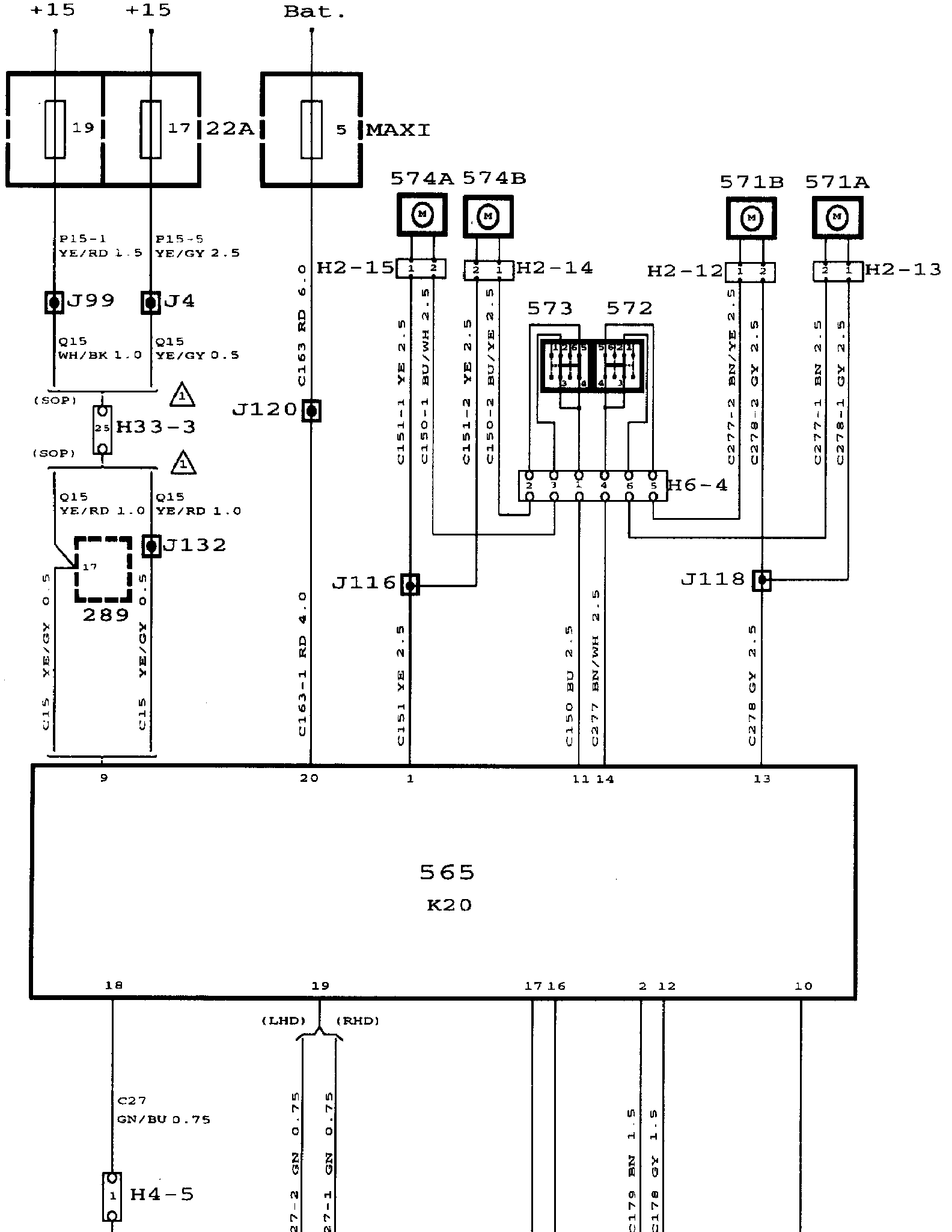 The system is supplied with current from the +15 circuit on pin 9 via fuse 19 or fuse 17 when the ignition switch is in the Start or Drive position and with current from the +30 circuit on pin 20 from the battery via maxi fuse 5 in the main max-fuse board. All the motors are supplied with power via this fuse.