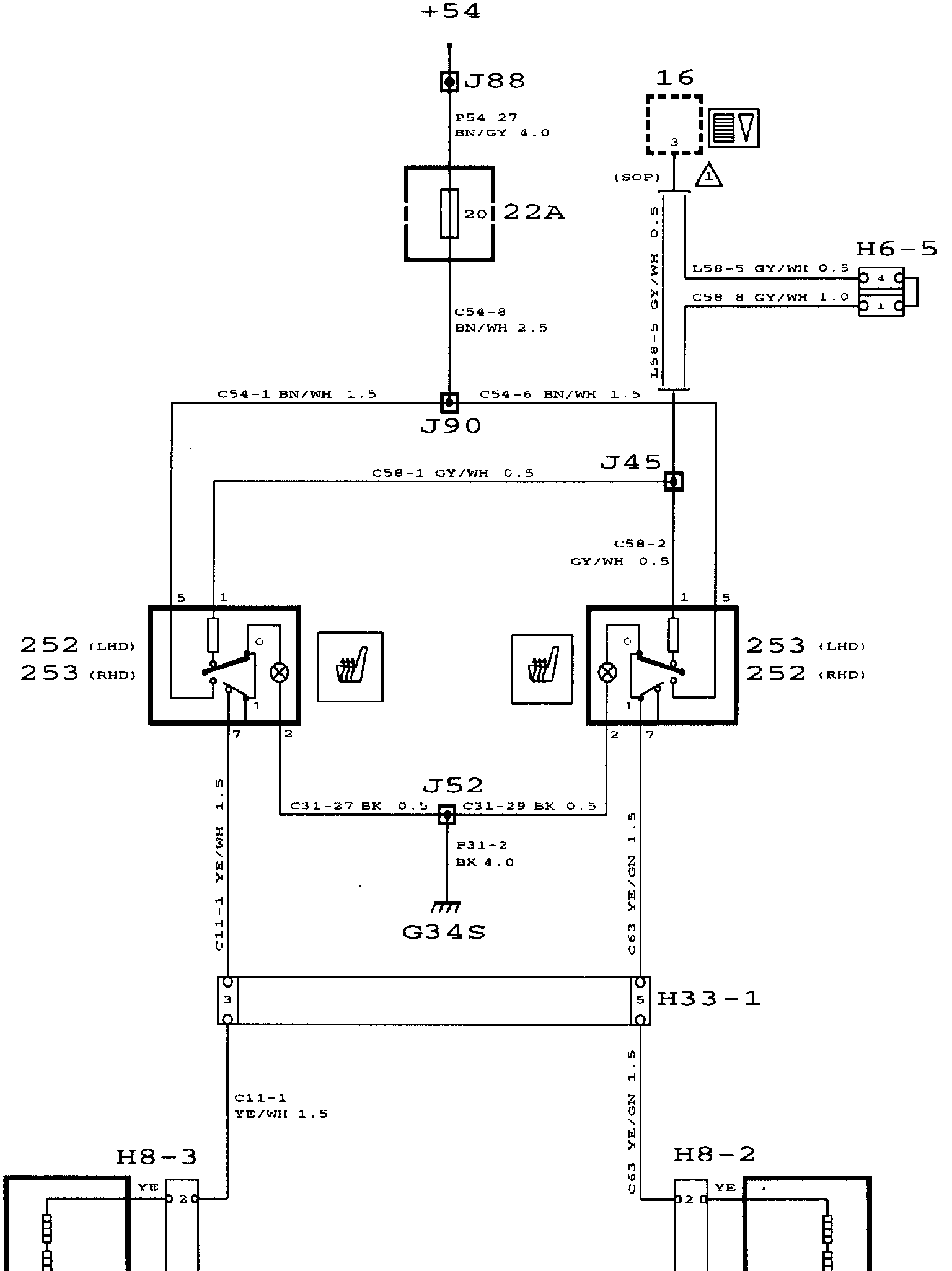 The heating pads are supplied with current from fuse 20 in main fuse board 22A. They are turned ON by means of switches 252 and 253.