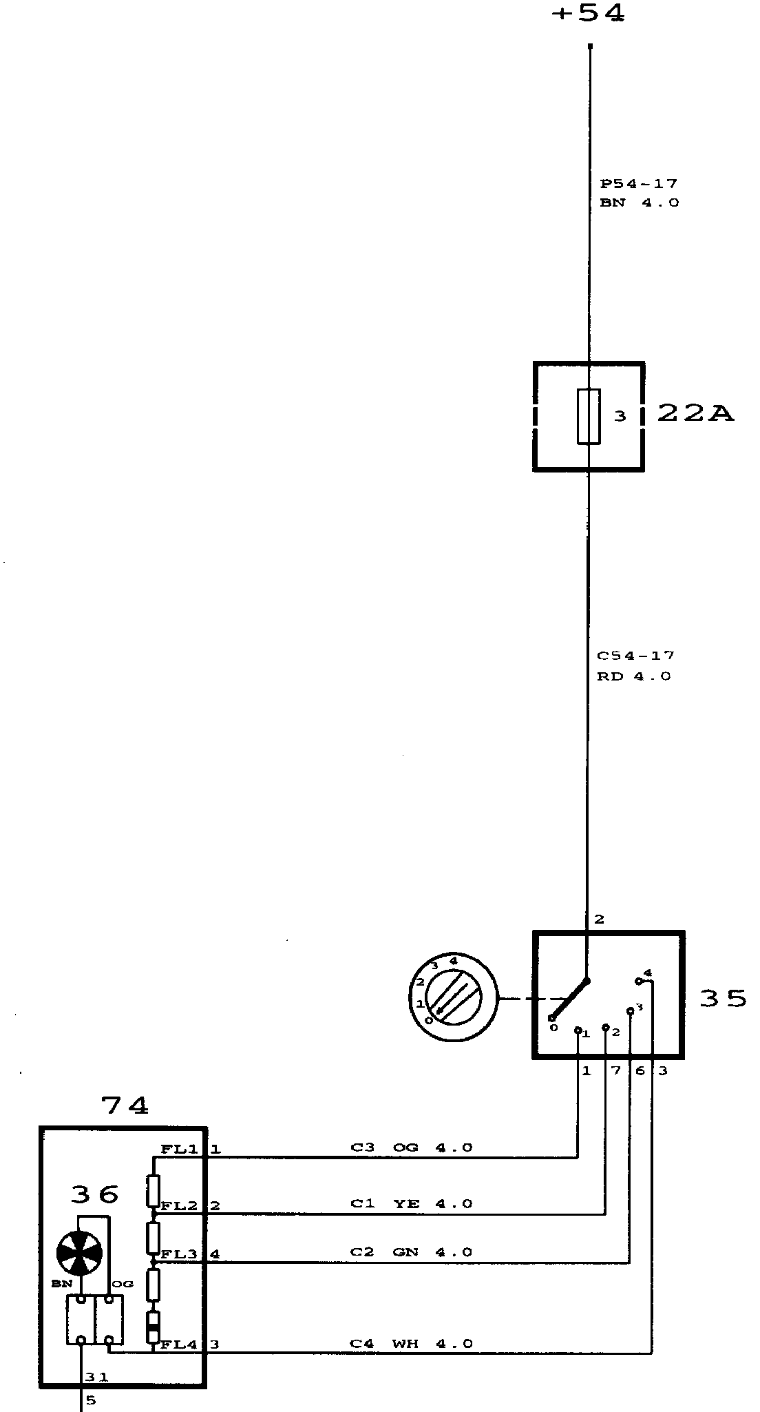 The ventilation fan switch controls the fan motor via resistor 74 and with the aid of the resistor it is possible to obtain four different fan speeds.