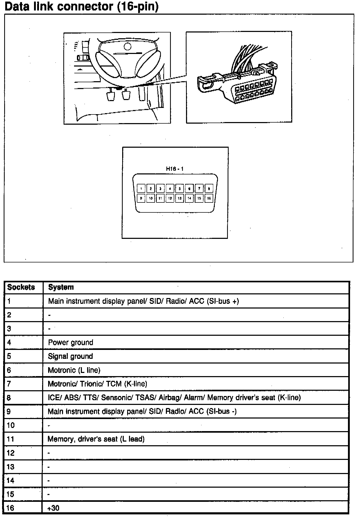 The connection (L lead) between pin 13 of the control module and pin 6 of the diagnostics socket (Data Link Connector) is utilized to activate flash codes.
